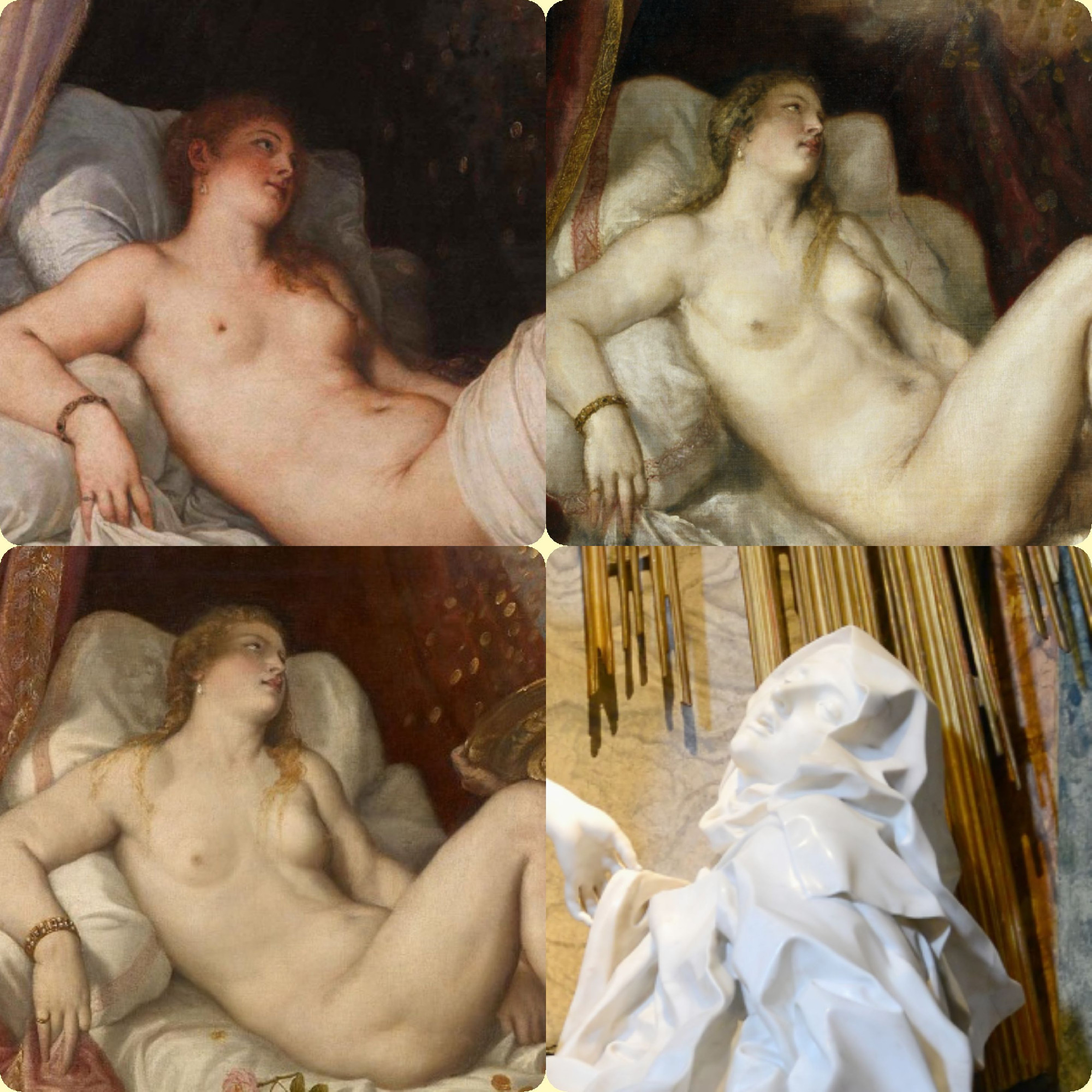 Sokak szerint Tiziano jegyzi a festészet történetének legjobban sikerült női aktját a madridi Pradóban őrzött Danaéval. A velencei mester ezúttal is meglehetősen szabadon értelmezte az eredeti mítoszt: homályos börtöncella helyett korabeli bordélyház enteriőrjét látjuk, az ágyon kéjesen heverő vörösesszőke kurtizánnal. A cserzett bőrű, idős szolgáló – aki kendőjével nevetségesen igyekszik összegyűjteni a mennyei mannaként szitáló aranyat – csupán arra szolgál, hogy Danaé szépségét és fiatalságát még inkább kiemelje; illetőleg ő közvetíti számunkra pénz és szexuális örömök közti nyilvánvaló kapcsolatot. Mindez kissé komikusnak tűnhet görög vázánk stilizált szépségéhez képest. Mintha Tiziano ismét a hajánál fogva rángatna elő egy újabb „Vénuszt” a görög mitológiából, pusztán azért, hogy a képalkotási tilalmak kijátszásával újabb mesteri aktot alkothasson. Csakhogy… Danaé körvonalai oly mértékben oldódnak fel (vagy olvadnak el) az aranyeső hatására, mintha megváltozna a halmazállapotuk és az ágyon minden mindennel összefolyna, így Tiziano illékony ecsetkezelése szintén tökéletes formai harmóniát alkot a mitikus deus (s)ex machina tartalommal. Ráadásul: az aranyesőt méhébe fogadó Danaé arcán a látomást átélő középkori szentek egzaltált arckifejezése tükröződik: pontosan úgy, mint például Bernini későbbi, Szent Teréz látomásáról készült szobrán. Tiziano valódi üzenetét tehát nem a pénz és a prostitúció közti kapcsolat rejti, hanem az, ahogy a Danaé-sorozat egyes darabjain dolgozva fokról fokra fedi fel előttünk szexualitás és egzaltáltság sajátos viszonyát, amit azért nem érzünk blaszfémiának, mert az antikvitásban a kettő szorosan összeforrott, úgyis mint „Danaé szextázisa”.