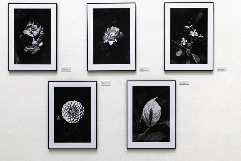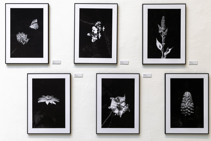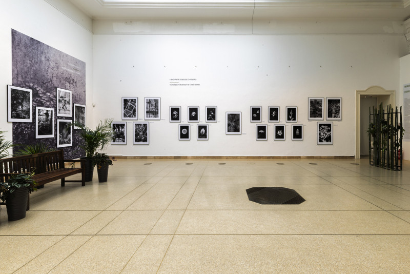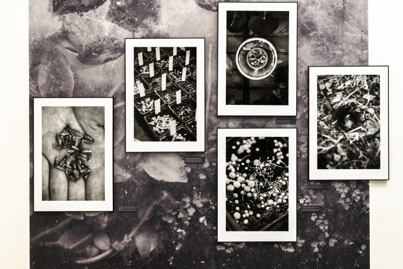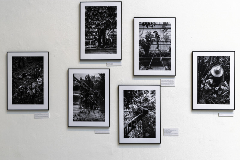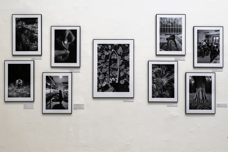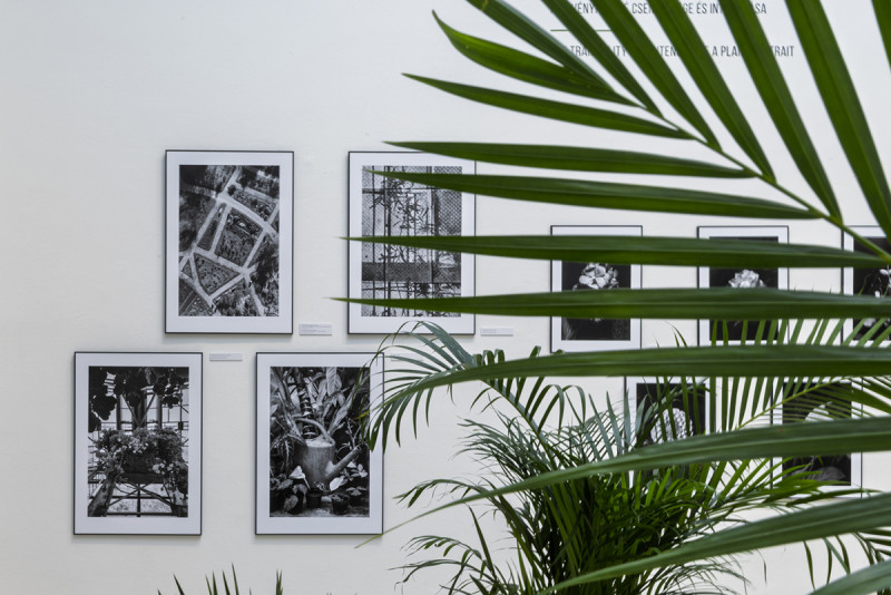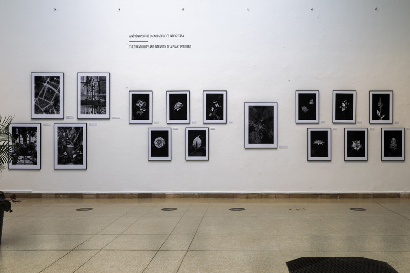 Virágok portréi, növényi szervek elmosódó, fekete háttér előtt, habitusfelvételek, drónnal készült pillanatképek az egyik oldalon – a másikon az ember és a növény botanikus kerti együttlétének képi dokumentumai, herbáriumkészítés, magvetés, növényápolás, kertművelés, a napi munkálkodás pillanatképei. A kiállítás szerkezete szerint pőre növénytestek az egyik falon, illetve a növény- és az embertest együttlétének pillanatai a másik falon – nos, az alkotói és a kurátori elképzelés indokolható.