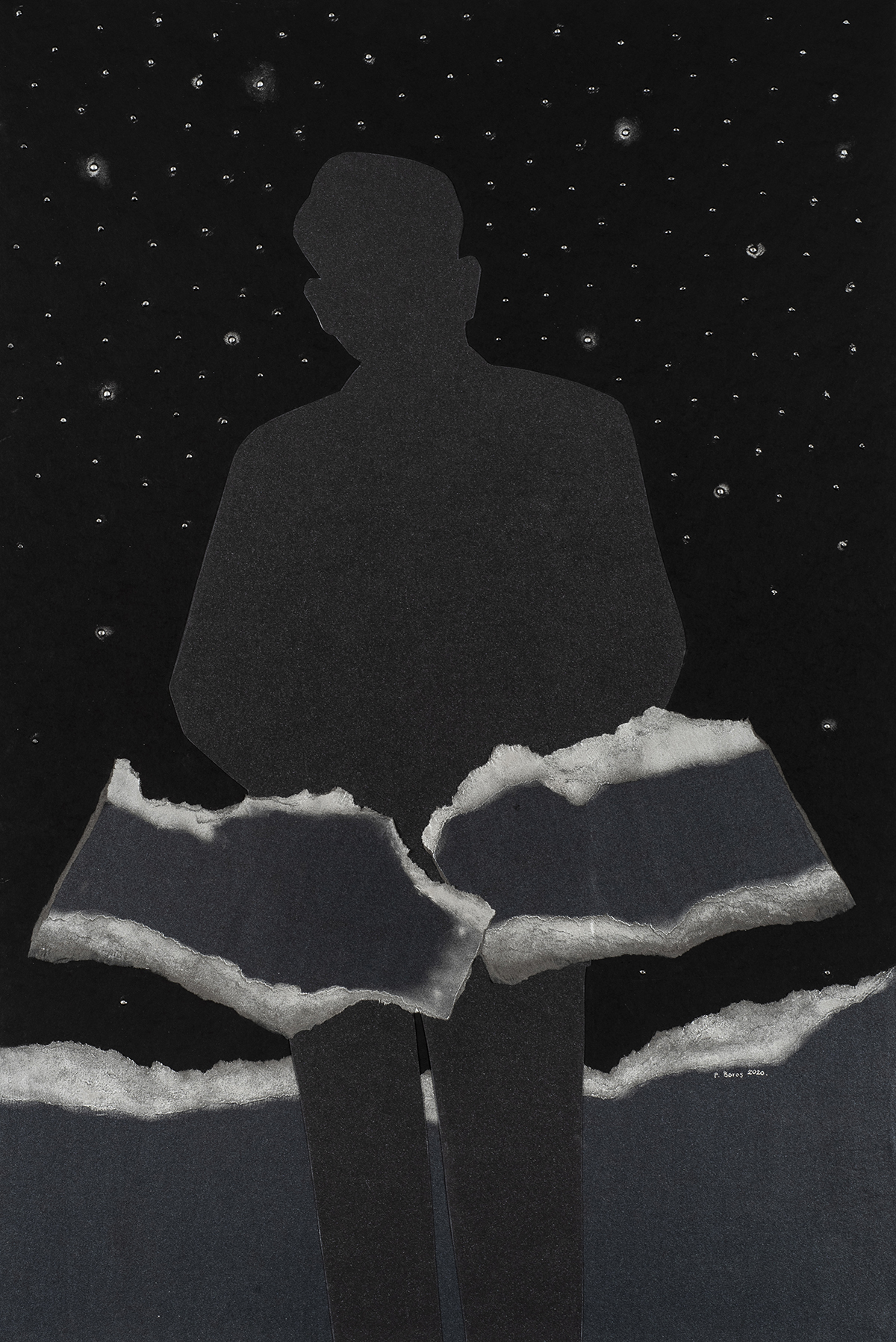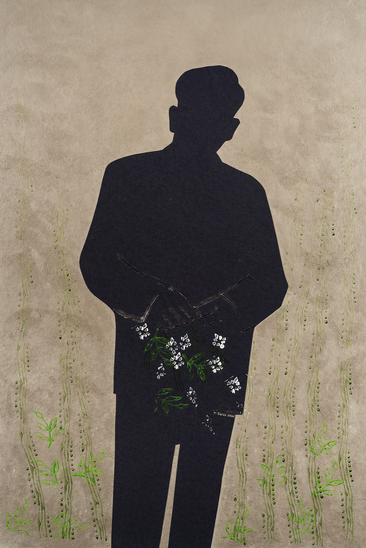 A tárlaton – s általában az életműben – kevesebb a figurális, értsd: az emberábrázolás. Ezek egyike az Apám emlékképe súlyos fekete sziluettje, melynek kezei a sztaniollal kialakított vaskos ujjak. Ezek tartják vagy épp engedik el a finom fehér és zöldszínű virágokat, míg a háttér a vidéki otthonokban egykor oly divatos növénymotívumú hengerelt falat idézi meg. (A művésznő maga készítette el ezt a nyomdahengert ehhez a képhez.)
