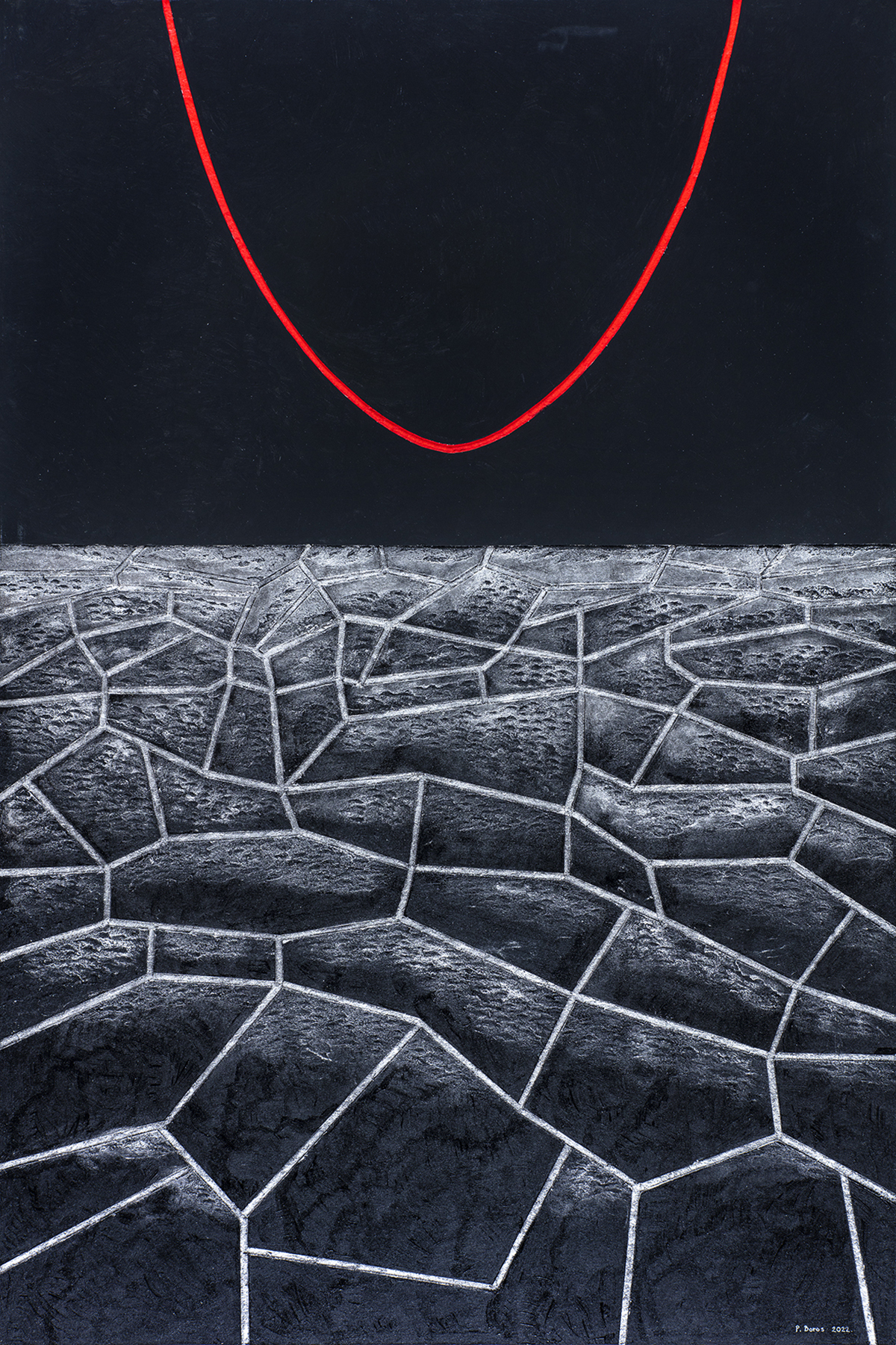 A Gyerekkori emlék vörös hátteréből kirajzolódó palmettás, kristályos sztélé mintha a gyermek és az emberiség gyermekkorának egyidejű emlékdarabja lenne. A Jelenés a kiszáradt ugar fölött fekete égboltra vizionált vörös íve szinte mitikus jelentéssel bír. A Feltárt horizont a bajai lelet izgalmas továbbgondolása, a széttördelt kereszt és az azt összefogó ezüstös körgyűrű egységében.