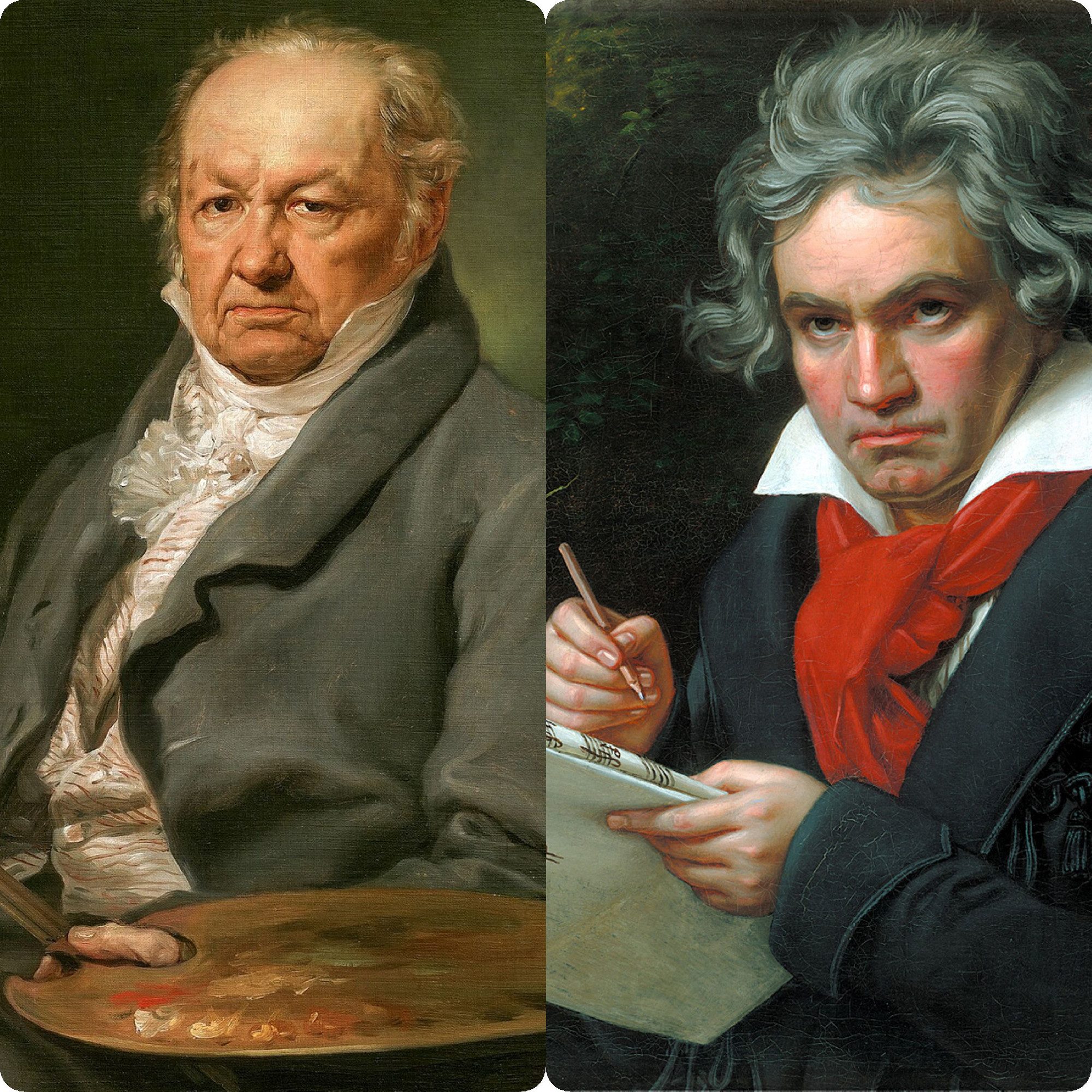 Goya és Beethoven nem csupán kortársak voltak, hanem olyan „lázadó titánok” is, akiknek hasonlóan tragikus végzet jutott. Goya pályája rendkívül sikeresen indult – ahogyan a fiatal, zongoravirtuóz Beethovené is – a spanyol királyi palota kedvenc udvari festőjeként. Ám szociális érzékenysége egyre mardosóbb lett, növekvő siketsége pedig idővel teljesen elszigetelte a külvilágtól, így saját vidéki házának falára festette utolsó opusát, a Fekete festményeket, melyek az emberiség kilátástalan harcát ábrázolják a kozmikus sötétséggel. A legismertebb Fekete festményen Kronosz (az Idő) akként falja fel saját teremtményeit, mint a francia forradalom. A sors különös fintora folytán Beethoven pontosan ugyanekkor, ugyanezen módon és tempóban siketült meg, valószínűleg szintén ólommérgezéstől, ám Goyával ellentétben művészi világa sohasem sötétült teljesen el, mindig nyitva hagyott rajta egy vakablakot. Gyötrelmes élete ellenére a róla készült legismertebb portrén heroikusnak látjuk, dúlt parókával, az ünnepi Missa solemnis komponálása közben. Korábban Napóleonnak dedikálta a Harmadik szimfóniát. Ám később e dedikációt olyan erővel vonta vissza – merthogy Napóleon császárrá koronázta önnön fejét –, hogy átszakadt tőle a partitúra. Nagy kérdés, napjainkban vajon visszavonná-e az Európai Unió hivatalos himnuszának választott Örömódát?