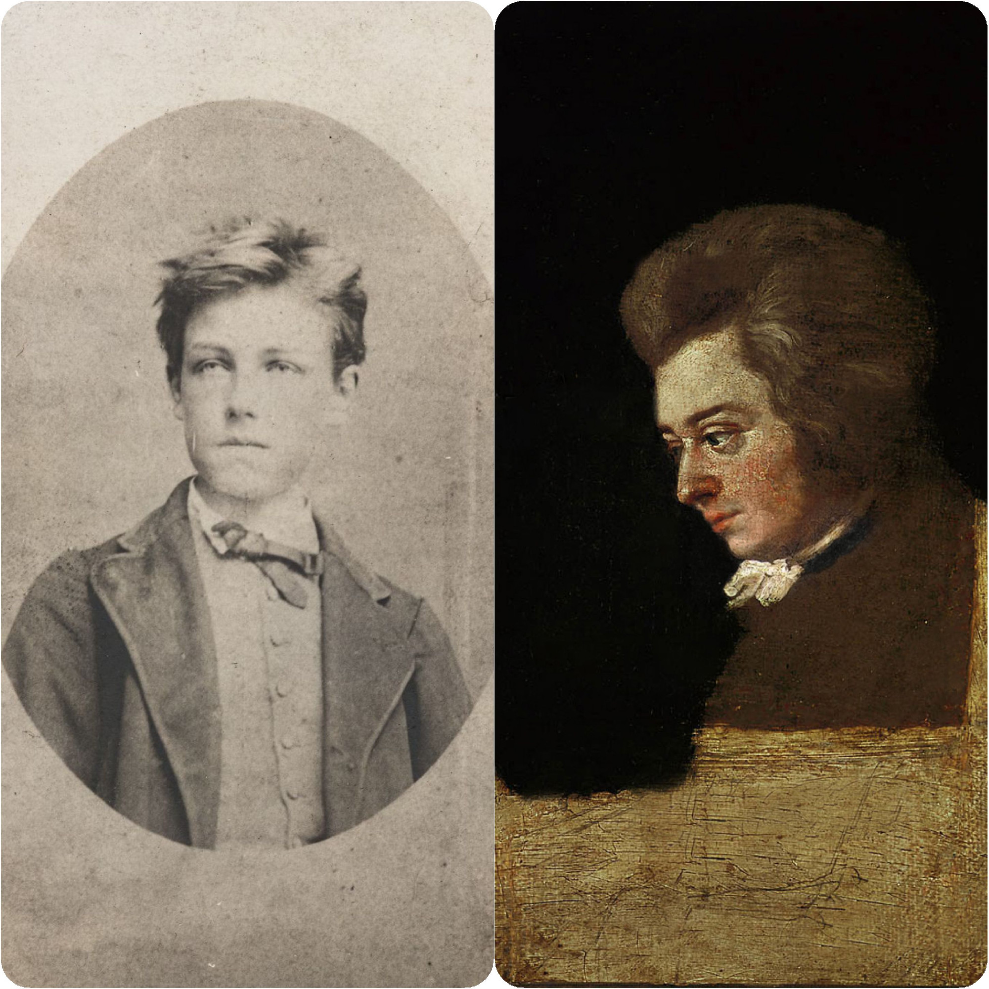 A véletlen különös szeszélye folytán Arthur Rimbaud szinte napra pontosan száz évvel Mozart halála után szenderült örök nyugalomra. Mozart harmincöt évet élt, Rimbaud harminchetet. Mindketten csodagyerekek voltak, és élénk érdeklődést mutattak az olyan okkult tanok iránt, mint például a szabadkőművesség (Mozart lelkes páholytag volt). Jelentős különbség, hogy Rimbaud egész „látnoki” életművét csodagyerekként alkotta, és húszévesen végleg búcsút mondott a művészetnek, s az afrikai Hararban kezdve új életet, mint kalandor, fegyvercsempész és kereskedő. Mígnem örökmozgó lábáról agresszív és gyógyíthatatlan szarkóma döntötte le. Hazatért, jobb lábát amputálták, ám végtagjai sorra bénultak meg, s nem sokkal később meg is halt. Lehetetlen nem érzékelni a „váteszi” hasonlóságot a legnagyobb versében hazatérő elzüllött Részeg Hajó(roncs) és az emberi roncsként hazatérő harminchét éves egykori költő között. De a gyerekzseni egyéb látnoki sorai is érdekesek: „Keresztes háborúkat álmodtam, fölfedezőutakat, melyekről nem maradt leírás, történelem nélküli köztársaságokat, elfojtott vallásháborúkat, erkölcsök forradalmát, fajok és világrészek áttelepítését; hittem minden varázslatban. Kitaláltam a magánhangzók színét! - Éj A, hab É, rőt I, kék O, zöld Ü. (…) Egy gyár helyén egész világosan egy mecsetet láttam.” – Rimbaud: Egy évad a Pokolban.