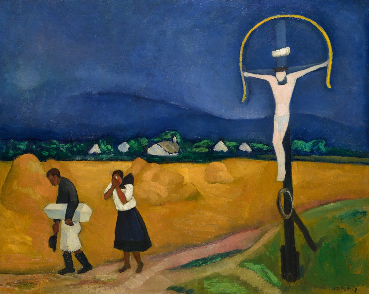 Czigány Dezső képe olyan agyonhallgatott témát ábrázol, egy „csóró cigánytemetést”, amely hasonló színvonalon a magyar irodalomban is csak évtizedekkel később, Balázs József Koportos című kisregényében jelenik majd meg. A gyászoló szülők mozgása röghöz kötötten darabos, az asszonyon nincsen cipő. A feszületen látható Krisztus ezúttal nem sárga színű, mint Gauguin képén, hanem hófehér, így nem árad belőle melegség, ugyanakkor csodás glória ékesíti, amelynek ragyogását még tovább fokozza a vihar előtti ég lilába olvadó kékje, mint jellegzetes színkomplementer, amitől a krisztusi példázatot idéző búzatáblák is vertaranyszínűek lesznek. Gauguin képén Krisztus hasát hasábformájúnak látjuk, ami a háttérben húzódó házikók „kubista” formáját visszhangozza rendkívül visszafogott módon, még véletlenül sem tárgyiasítva Krisztust. A Gyermektemetésen a feszület beleolvad a síkba, Krisztus ragyogó fehér színe azonban mágnesként vonzza a tekintetet, és e zseniális színkontroll révén szemünk máris a szintén hófehér gyermekkoporsóra téved, amely olyan kicsiny, hogy elfér a gyászoló apa hóna alatt. Formáját szinte észrevétlenül, még véletlenül sem hivalkodón echózzák a távoli hófehér házak, jelezvén, hogy e koporsó lesz az új hazában a gyermek háza. Czigány Dezsőnek kivételes szeme és intellektusa volt a művészethez, így tudta létrehozni ezt a remekművet, ám későbbi képeiből hiányoznak az önálló témák és stílusjegyek, ami miatt külföldön nem boldogult, s nem fogadta be őt a nemzetközi művészeti kánon, mint Vasarelyt vagy Hantai Simont. Amíg Ady „műfordítóként” is originális volt, és megvetette a külföldi példák másolását, addig Czigány képei rendszerint Cezanne-, Gauguin-, Matisse-utánérzések, stílusuk pedig sokszor bántóan hideg, kimért és tárgyilagos. Azok a képei igazán jók, melyeken az elhatalmasodó elmebaj jeleit látjuk, mint a Kiáltó katonán és néhány cezanne-i csendéletén, ahol a befordulást egy-egy sötét faszobor jelképezi – a la’ Gauguin. Egyik utolsó, fuvista stílusú önarcképén már nem is „vadnak”, inkább a Batman-filmekből ismerős zöldhajú, véresszájú Jokernek látjuk.