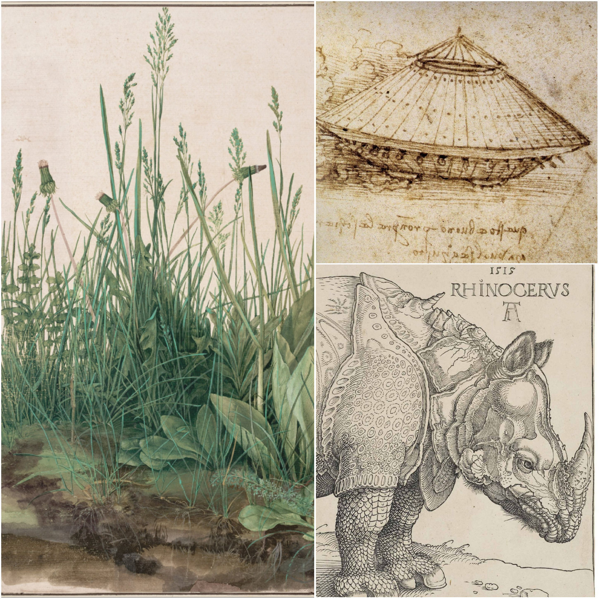 Hasonlóan éles a verseny Leonardo és Dürer tanulmányai között. Leonardo ördögi zsenialitással tervezte meg az első „tankot”, ám Dürer sem volt lemaradva tőle, azzal az érdekes fametszettel, amely egy tetőtől talpig felfegyverzett és felpáncélozott rinocéroszról készült. Míg Leonardo az emberi test titkait kutatta, addig Dürer érdeklődése inkább a természet felé fordult, és végső konklúziója a Rinocérosszal meglehetősen modern és lesújtó volt: a háború nem az emberiség találmánya, hanem egyetemes érvényű törvényszerűsége annak az Anyatermészetnek, melyben minden élőlény szüntelen létharcot vív és fejleszti magát a gyilkolásban. Csupán a növényi létezés lehet teljesen mentes az erőszaktól. Ezt az emberen túli, szinte már poszthumán világot ábrázolja Dürer látszólag legjelentéktelenebb, valójában talán legjelentősebb alkotása, a Nagy Fűtanulmány. Csupa puha, lágy és ártatlan forma tetőtől talpig zöldben, kiváló ellenpontja az evolúciós skála másik végén tanyázó behemót Rinocérosznak. Dürer finom ecsetvonásai tökéletesen érzékeltetik az emberi perspektíva viszonylagosságát, és mintha tapintani lehetne Dürer tudományos érdeklődését művészi ecsetvonásai mögött, hiszen valójában a fűcsomók színének és működésének titkát kívánta kifürkészni.