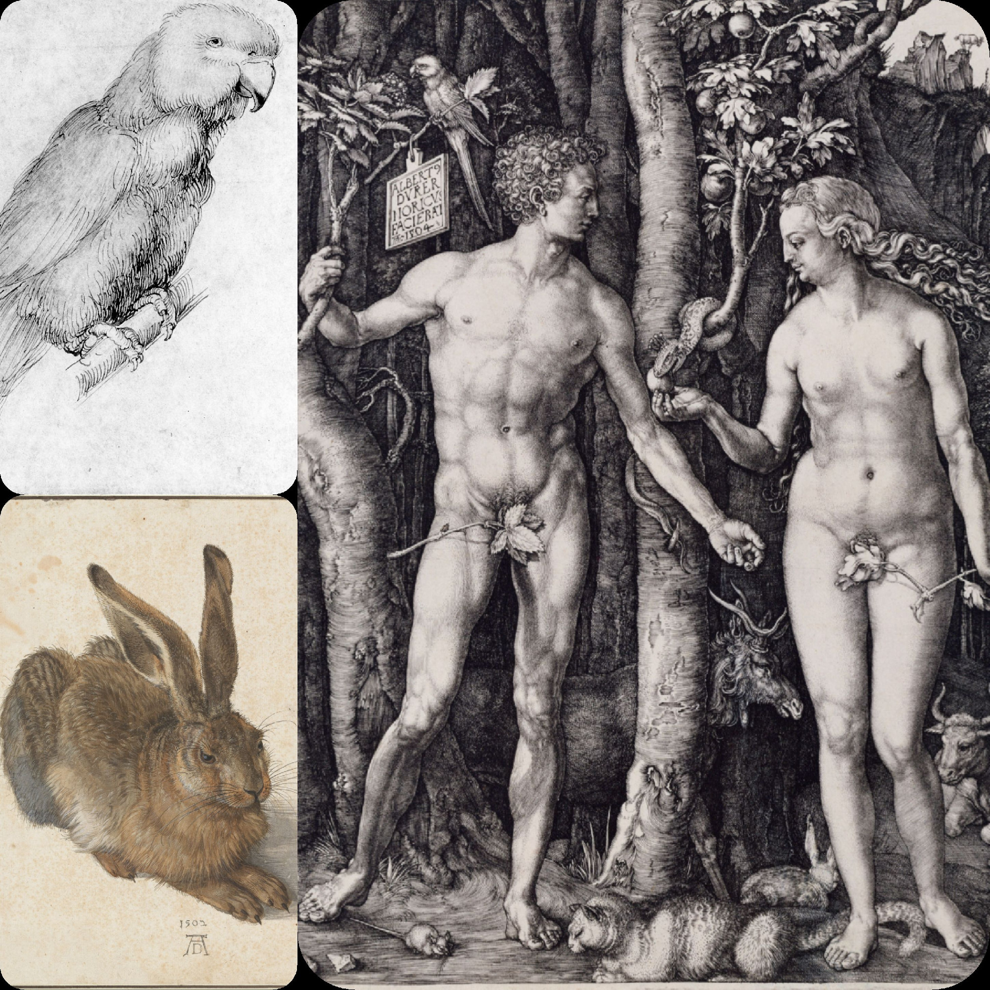 Dürer rajzai és metszetei textúrák tekintetében páratlanok. Ádám és Éva című híres metszetén a nyúl és a macska szőrének puhasága és selymessége kiváló kontrasztot képez a háttérben látható kősziklákkal. Emellett minden állat szimbolikus: a nyúl például a bujaság szimbóluma, a kőszirt szélén álló kőszálikecske pedig kétségtelenül a bűnbeesésre utal. A szimbolikus állatok élethű ábrázolását kiváló tanulmányok (Papagáj, Nyúl etc.) előzték meg.