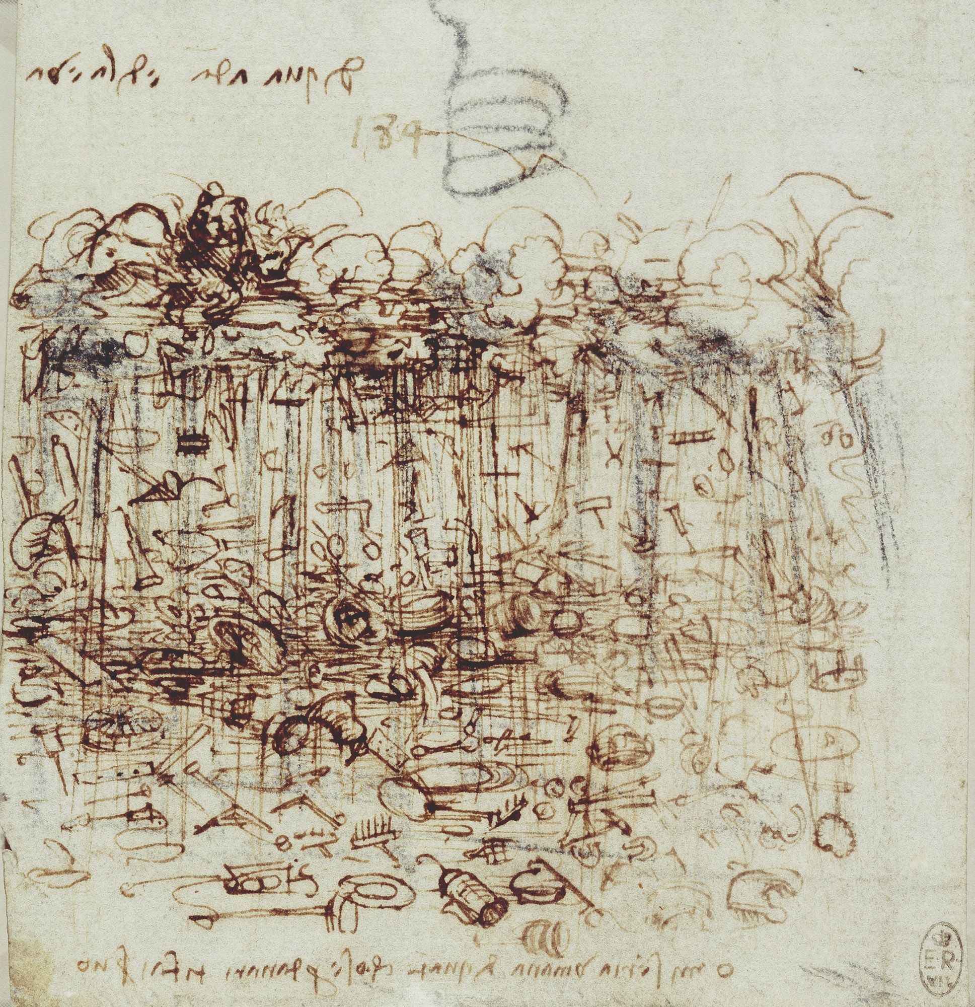 Ám még Dürer eme remekbe szabott Paradicsoma is elhalványul Leonardo lenti rajzának kreativitása mellett. E viharos skiccnek látszólag semmi köze a bűnbeeséshez, holott valójában ugyanarra a témára épül. Leonardo itt éppoly kreatív, mint találmányai esetében, és még a kép alcímét is tükörírással jegyezte fel: „Ó, emberi nyomorúság! Mennyi mindent kell megtenned a pénzért!” Ami biztos: különféle tárgyak – szegek, harapófogók, sarlók, sarabolók, dobok, dobozok, gereblyék, létrák, csengők etc. – záporoznak az égből, látszólag kaotikusan, valójában sokak szerint rendkívül tudatos módon: ők volnának ugyanis a bűnbeesés után nyakunkba szakadó emberi munka nélkülözhetetlen kellékei! Dokumentálható, hogy ritkán ugyan, de kialakultak olyan tornádó típusú forgószelek Itália földjén Leonardo korában is, melyek képesek voltak tárgyakat „teleportálni”, így e tanulmány – bár nem tűnik valódi forgószélnek – önmagában is nagyszerűen illeszkedik a Codex Atlanticus többi kiváló rajza közé, ám igazán zseniálissá Leonardo szárnyaló fantáziája teszi.