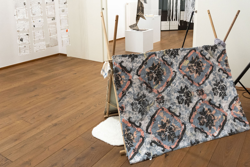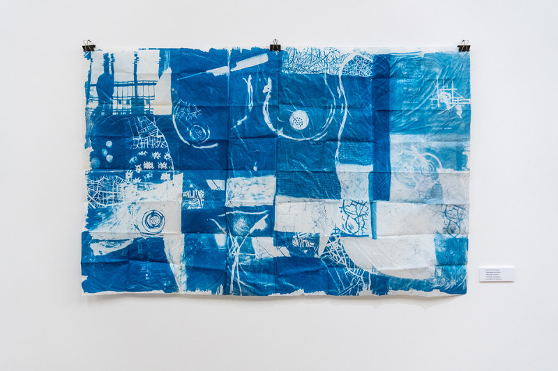 Mellette Sz. Eszteró Anett kompozíciója személyes fizikai és belső, érzelmi teret jelenít meg. Saját gondolatait és általános nőiséggel kapcsolatos motívumokat fogalmaz kompozíciójába, melyen hajtogatás nyomai láthatók. Akár egy térkép. Felsejlenek benne naplójegyzetek, a házimunka, a magánélet kellékei, amelyeket intim határvonalak kerítenek el.