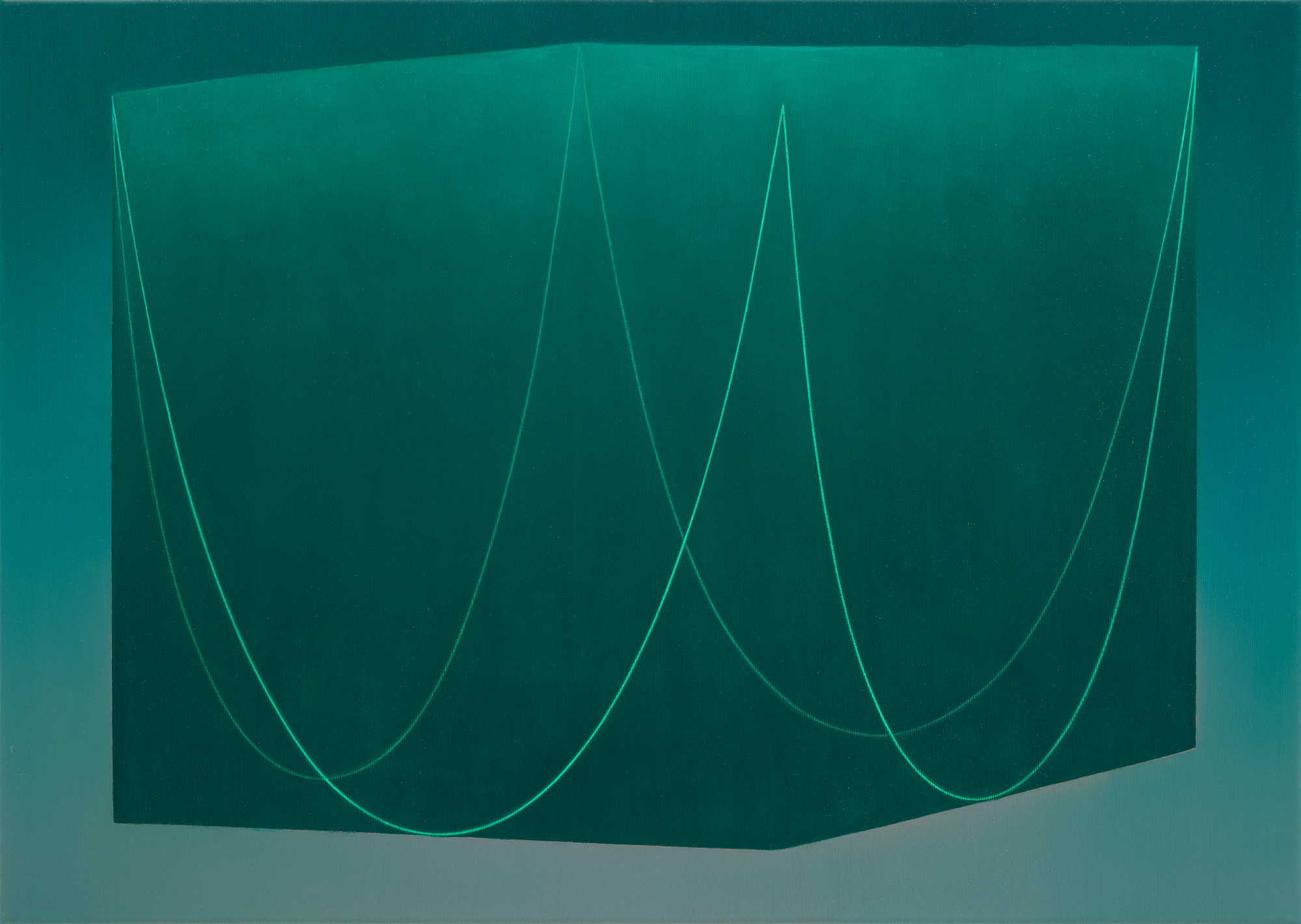 A Láncgörbék akrillal, olajjal vászonra készült meditatív kompozícióin a címbeli alakzaté a főszerep. Láncgörbét akkor kapunk, ha egy láncot, fonalat két végénél egy pontra felfüggesztünk. „A most bemutatott képsorozatom láncgörbék által meghatározott elképzelt terekből indul ki” – mondja tárlatáról Haász Katalin, majd így folytatja: A „görbék determináltsága a Fekete Gömb láncgörbékkel (2021) című installációm készítésekor kezdett foglalkoztatni.” Az alkotó úgy véli: „A két ponton felfüggesztett, egyenletes elemekből álló lánc saját súlyánál fogva mindig »egyféle« parabolához hasonló alakot vesz fel.”