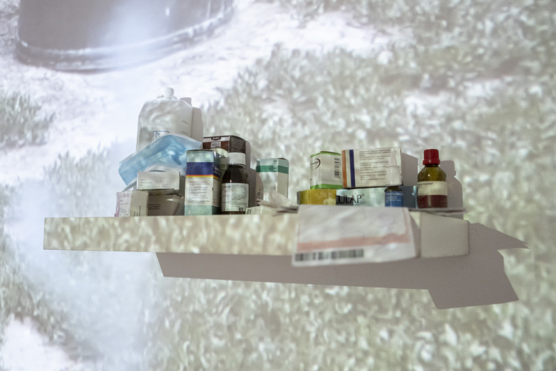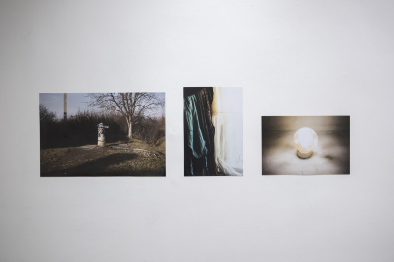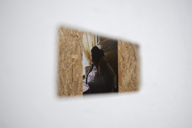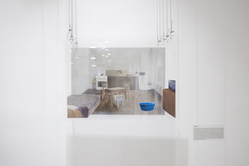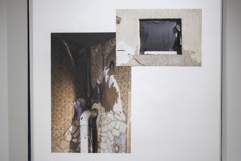 Hatalmas dobozban, a tér közepén a kiállítás szereplőinek mosdótereiről készített képek vannak a falra erősítve, melyeket csak akkor tudunk igazán megtekinteni, ha az erre kialakított kukucskáló lyukakba belenézünk. A bepillantás gesztusa szinte tükörképe annak, ahogy a kiállítás betekintést enged a négy nő történetébe: miközben egyre jobban elmélyülünk a fényképekben és szövegekben, úgy rajzolódik ki előttünk, hogy a személyes tapasztalatoknak közös a gyökerük, a lakhatási nehézségek megélése nem egyéni, hanem kollektív élmény.