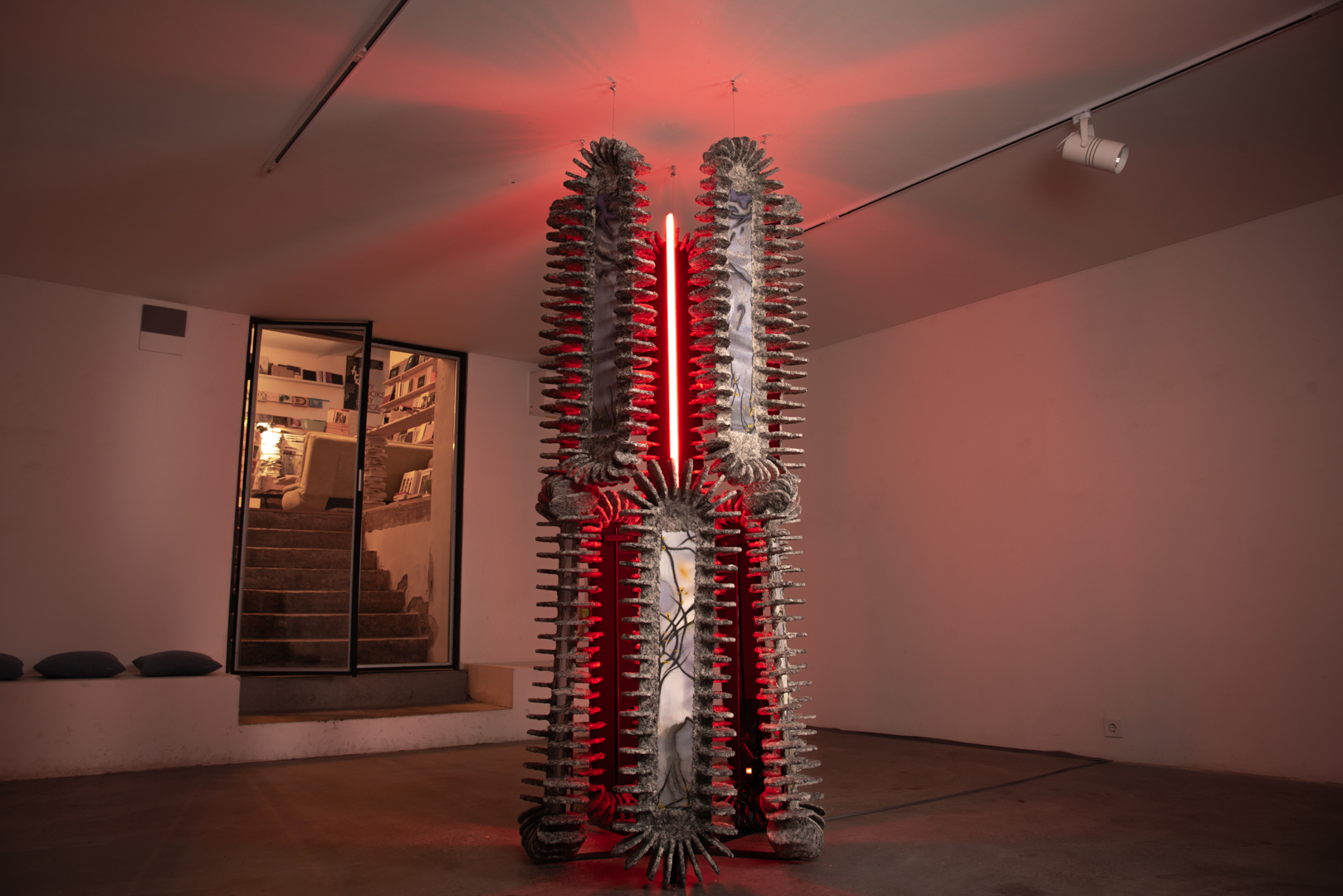 Lépcsőfokok vezetnek le az Az ISBN Books + Gallery kiállítóterébe. Az üvegajtón benyitva vöröslő fényben úszik a csaknem üres tér, amelyet a középen magasodó, nagy méretű installáció ural. Vörösen izzó organikus építmény, fénynyalábbal a közepén. Voltaképpen lépcsőzetes torony, amely élőnek tetsző elemekből épül fel, vázát papírmasé-lapocskák adják. Címe egyben a tárlaté is: I shall now count from one to ten. I say one… (2024). Az elnevezés Lars von Trier dán filmrendező Európa (1991) című filmjéből származik.