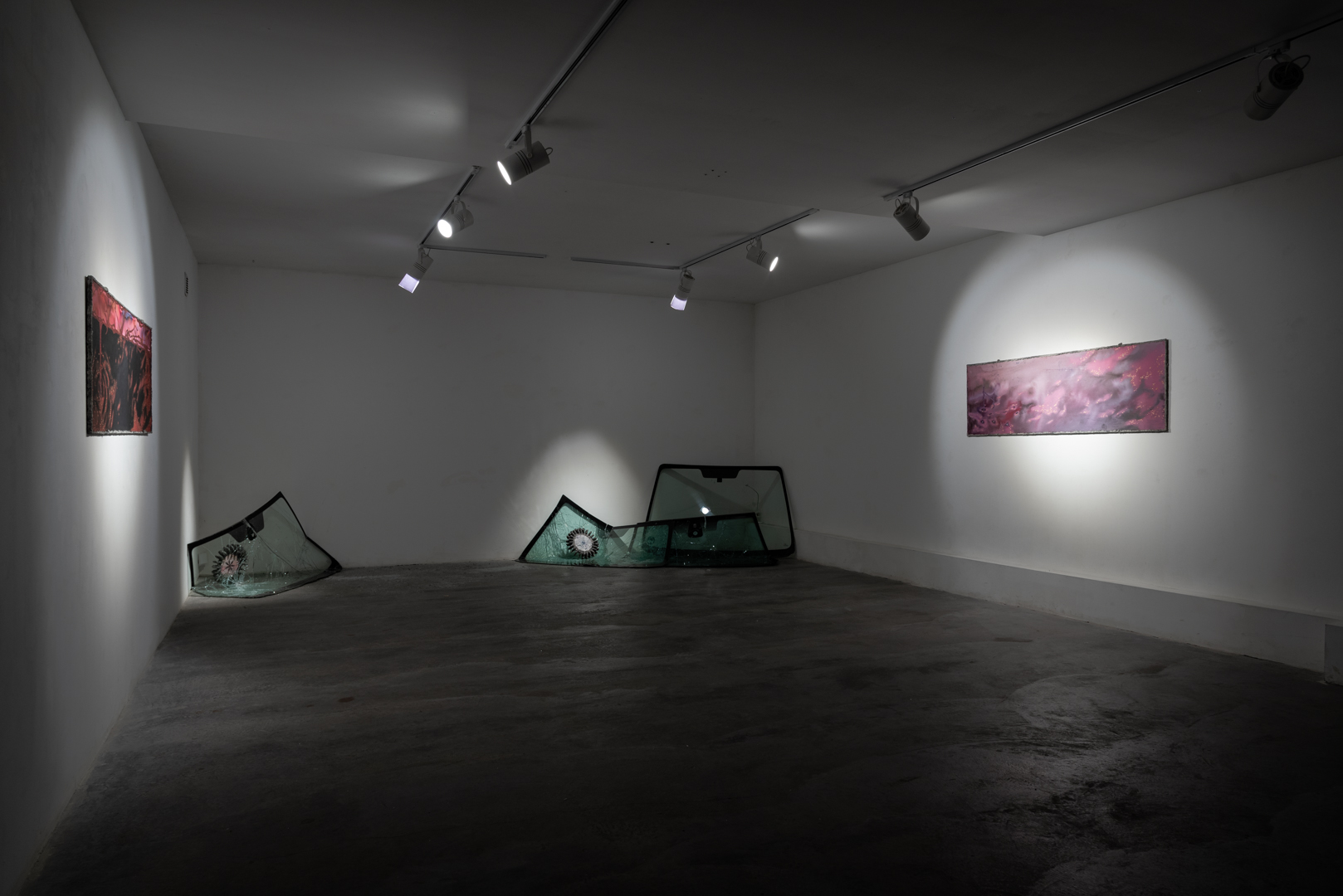 Figyelemre méltó egy másik, Deep into the Unknown (2023) címmel ellátott installáció is. Az akvarellel, akrillal, pasztellel, MDF-lemezzel, papírpéppel és üveggel készített alkotás autók összetört szélvédőjéből áll. Az enyésző tárgy organikussá válik, beépül a tájba, ahogy az emléklenyomatok. Csatlós ezeket teszi hozzáférhetővé kollektív emlékezetünk számára is.