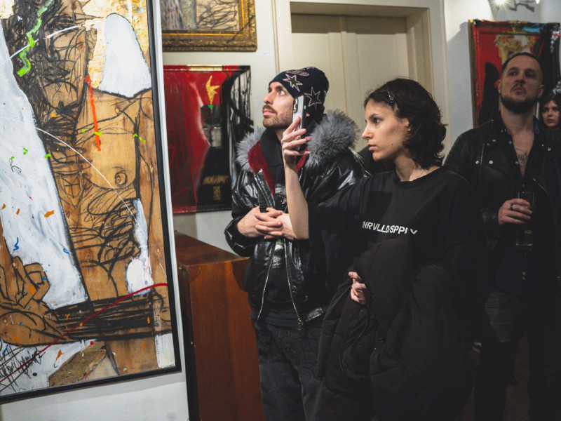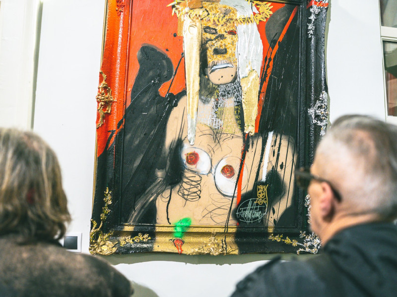 Lekaparja, vagy úgy hagyja ismeretlen pingálók eredeti munkáit, és fölülírja a saját jól ismert toposzaival. Sok a „Szelfi”, hullámos haja leomlik, eltakarja a fél arcot, inkább szelíd, mintsem dühös, de azért ökölbe szorított kezének középső ujját mereven felfelé tartva bemutat a világnak. „Különvélemény”. Több festményen is ott ragyognak a mantra sorai: „Megértettem a létezés remény értelmét, nem nyomnak paradigmák…” és így tovább, háttérként töltve ki a képteret.