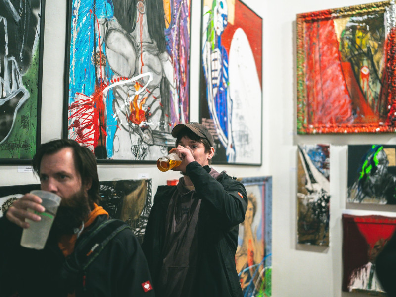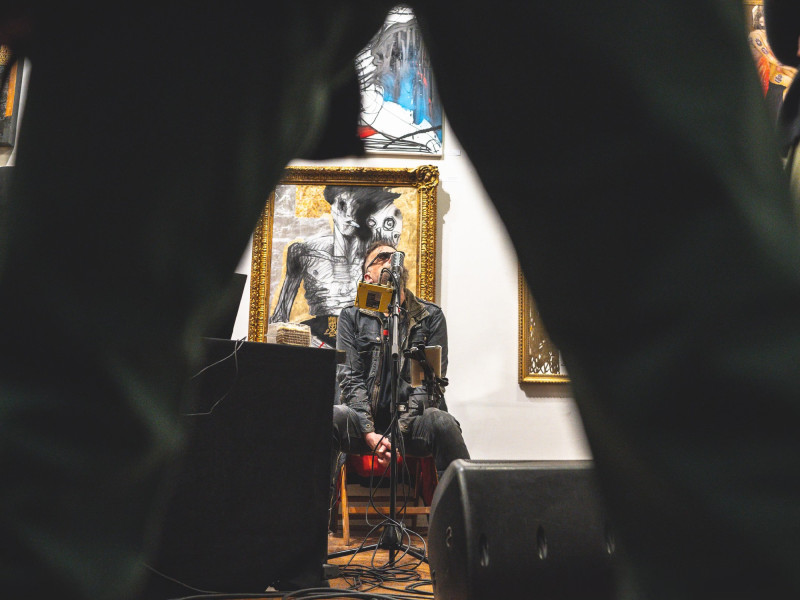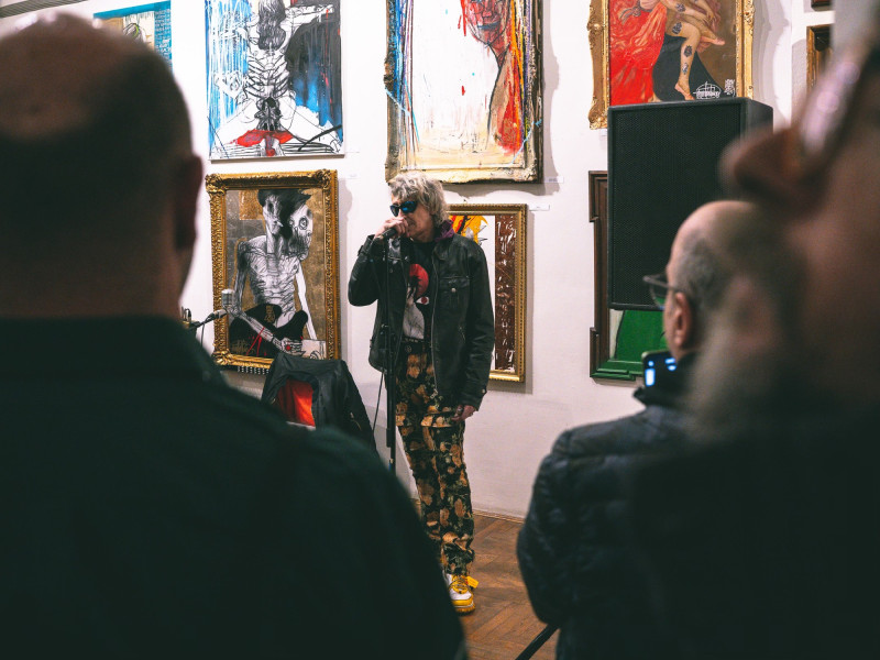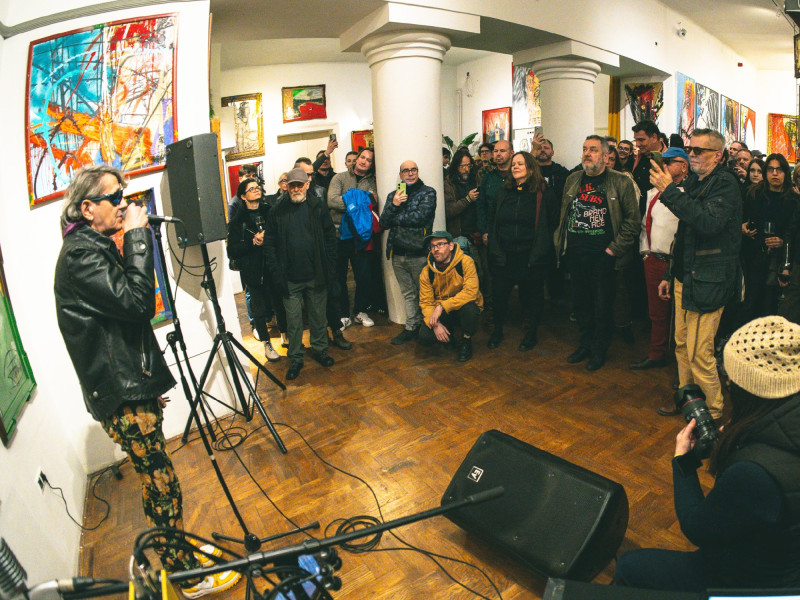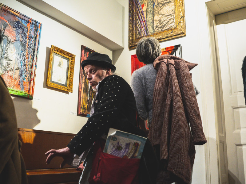És azóta csinálja, őszintén, megszállottan. Életnívója alig van a hajléktalan-lét felett, nincs jövedelme, nonprofit gyűjtői körének eseti védőhálója tartja felszínen, és teszi lehetővé, hogy kizárólag saját intranzigens világának megfelelve alkosson. A mostani kiállítás is ennek köszönhető. Valójában születésnapi ajándék a tárlat egy művésznek, aki jó ideje leginkább kultkocsmák falain mutatta be műveit. Kis katalógus is készült, ez is afféle szamizdat, se kiadó, se ISBN-szám, csak képek, címek, alapadatok.