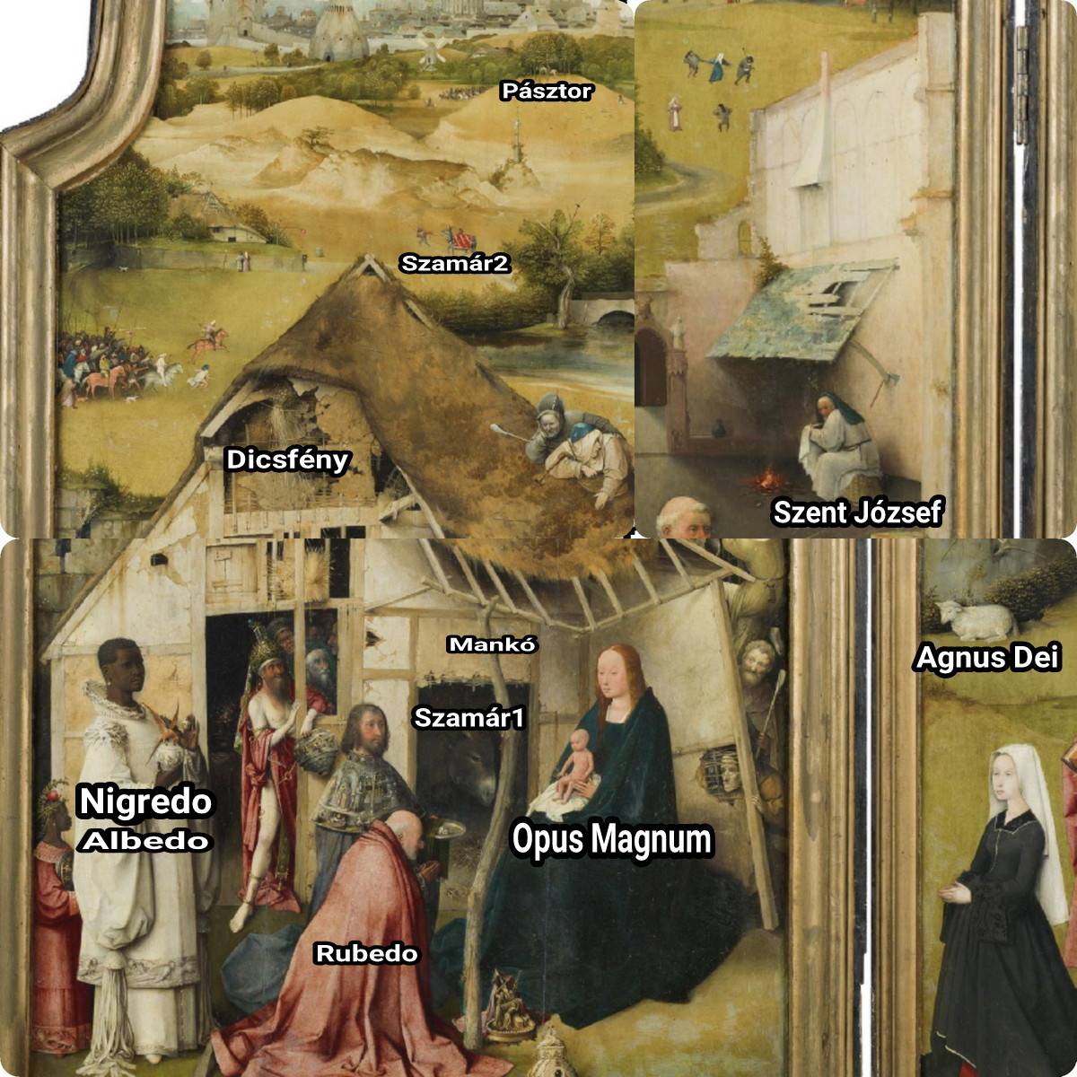 A legtöbb figyelmet természetesen a Háromkirályok kapják. Gáspár (jelentése: Kincstárnok) közvetlenül Jézus előtt térdel, és nevéhez hűen aranyat adományoz. E díszes aranyszobor jelképes módon Izsák feláldozását ábrázolja. Menyhért király palástja olyan, mintha ezüstből öntötték volna, és ebbe az ezüstpalástba vésték volna, amint Sába királynője tömjént ajándékoz Salamonnak. Ám a legcsodálatosabb Boldizsár, a harmadik király. Hófehér szelencéjében illatos mirha lapul, melynek légiességét a szelencén trónoló griffmadár jelképezi. Kivételesen éles és jól sikerült férfiportré, ám igazi szimbolikus jelentőségét a fekete-fehér kontraszt adja, Bosch ugyanis teljesen tudatos módon idézi meg itt az alkimista rituálé három lépcsőfokát: a Feketedést I. (Nigredo), a Fehéredést II. (Albedo) és a Vörösödést III. (Rubedo). – Boldizsár, a szerecsenkirály egymaga testesíti meg az első két lépcsőfokot, ám a harmadik lépcsőfok, a Vörös Oroszlánból kibontakozó alkímiai Opus Magnum, nem Gáspár király díszes aranytárgya lesz, hanem maga a Megváltó, Jézus Krisztus, akihez ugyan vándorlásai és prédikációi során főként a fehér köpenyt tudjuk társítani, ám aki a töviskoronázás során bíborba borul! Ezt jelképezi a jászolból kikandikáló démoni-aberrált alak. Bosch ahhoz hasonló bonyolult, mély pszichológiai összefüggést ábrázol autodafé és szexuális aberráció között, mint a későbbi Töviskoronázáson. Komoly kórkép, ám a lényegen nem változtat: az Opus Magnumot ne valamiféle bőségszaruként képzeljük el, hanem Jézus Krisztus igéjeként, teljesen ingyenesen.