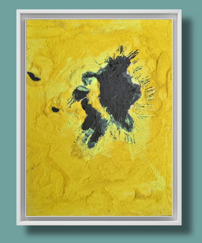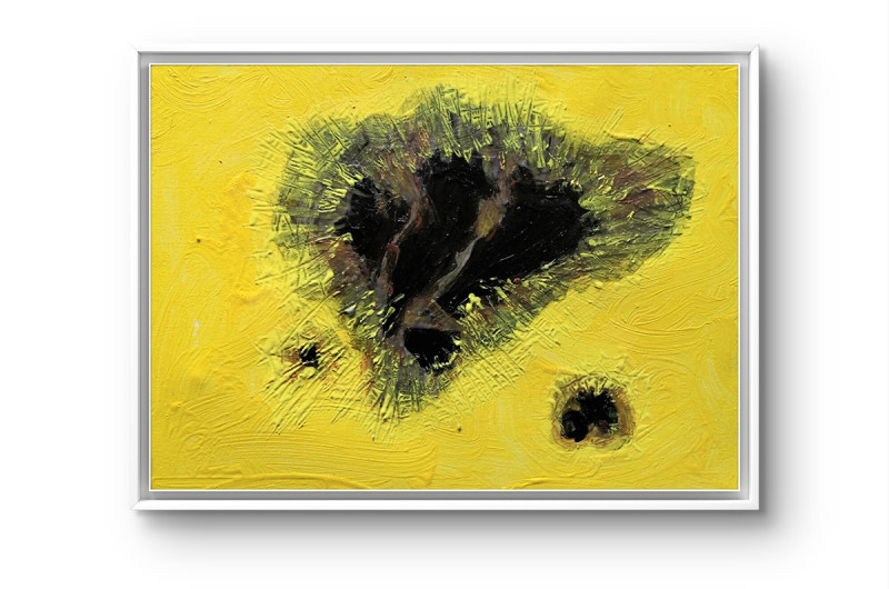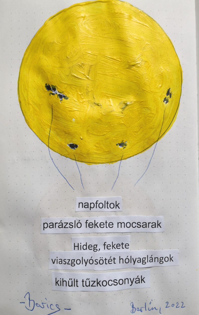 Napfoltokat ábrázoló képeiden az extrém sárgák kiváló összhangba kerülnek a lehető legsötétebb feketékkel, ami a természetben viszonylag ritkán fordul elő. Ugyanakkor a híres bizánci ikonok aranyszínű hátterére is emlékeztetnek. Jól tudom, hogy a legújabb „napfordulós paradigmaváltás” tézise szerint a háborúk – így az ukrán és palesztin háború is – összefügghetnek a napfoltokkal?