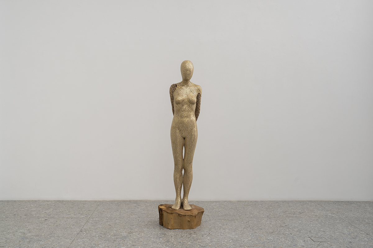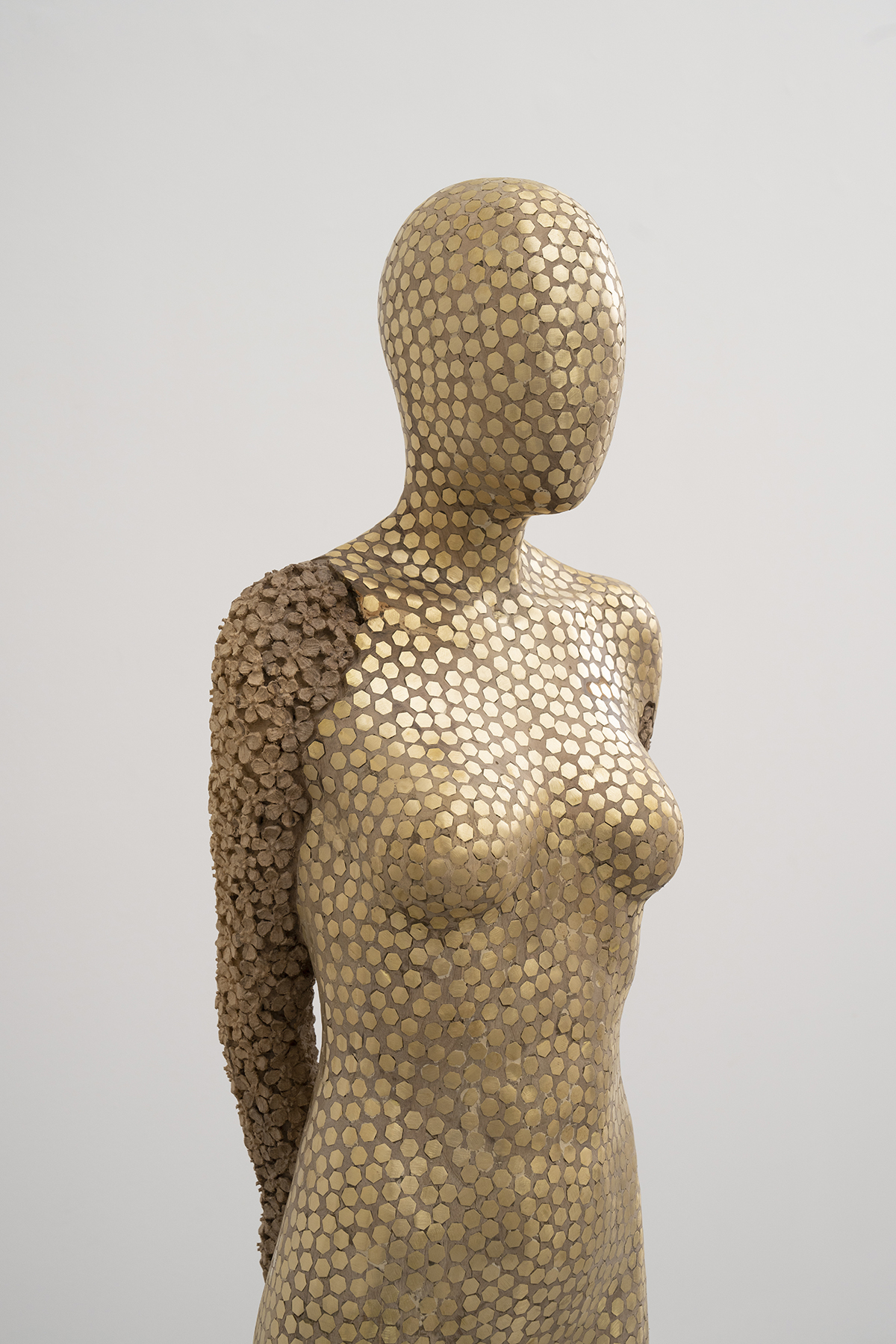 Ez a mostani szobor filigrán figura: az emberléptéknél kicsit kisebb és vékonyabb. Ennek egyrészt az az oka, hogy ekkora diófarönkből kezdtem el dolgozni, másrészt szerettem volna védtelenebb emberi alakot megformázni, mert úgy gondolom, hogy ez szépen illik magához a mozdulathoz. A karjait hátrafonja, ami erősíti a finomságát, törékenységét, ugyanakkor frontálisan nézve a high-tech-felületnek erősebb, dominánsabb lesz a megjelenése. Az arca maszkszerűnek hat, ami egyrészt az érzékszervek hiányából, másrészt a formából fakad. A rajta szereplő fémelemek pedig érzékelőkként a korallokra vagy tapadókorongokra emlékeztetnek, amelyek minden irányban fogják, érzékelik a külvilág jelenségeit.