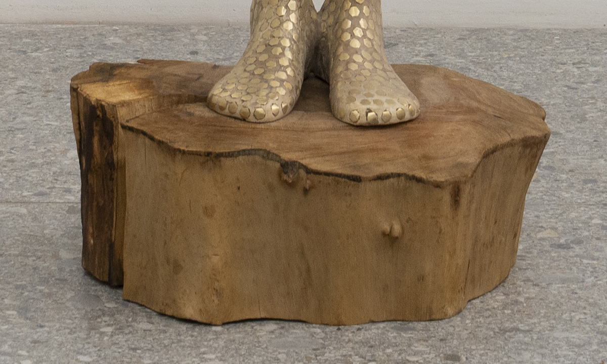 Miután a szobor elkészült, meg kellett találni a számára megfelelő talapzatot is, ezekből mindig több is jelen van a műtermemben, és gyakran próbálgatom, hogy mi az, ami illik az adott szoborhoz. Ez ennél a munkánál eléggé egyszerű volt, ez a diófatalp volt az első, amire rápróbáltam, és éreztem, hogy tökéletes hozzá, ezért végül ez is maradt.