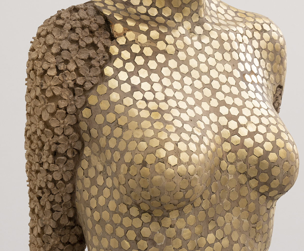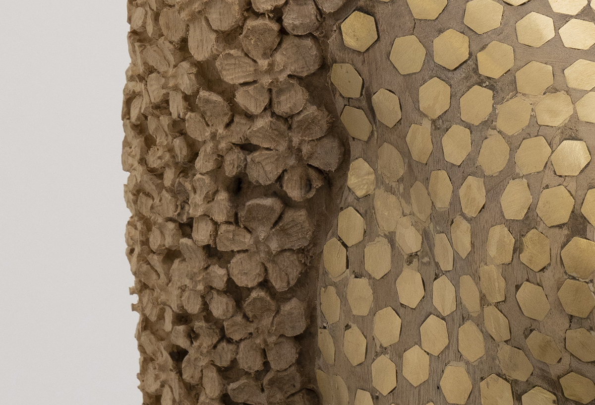 A figurát először a maga teljességében megfaragtam, majd nagyjából bejelöltem, hogy hol húzódnak a különböző formaegységek határai. Ezután a páncél készült el, megformáztam, majd elkészítettem a lyukakat a felületbe, amelyekbe bekerültek a 0,5–1 centiméter hosszú, hatszög alakú fémrudak. Ezeket beleültettem a fába. Képzeld, ebben a munkában több mint ötven méter sárgaréz rúd van, ami meglehetősen súlyossá is teszi ezt az alakot. Majd amikor ezzel megvoltam, az egészet lecsiszoltam, hogy a fafelület és a rézelemek egy síkba kerüljenek, helyenként az anyag már csak lapszerűen maradt meg. Legvégül a virágok megfaragását végeztem el, amelyek tulajdonképpen elvétellel jelentek meg a munkán. Ezeket nem rajzoltam elő, mivel egyfajta motívumot használtam, így lehetett fokozatosan haladni velük.