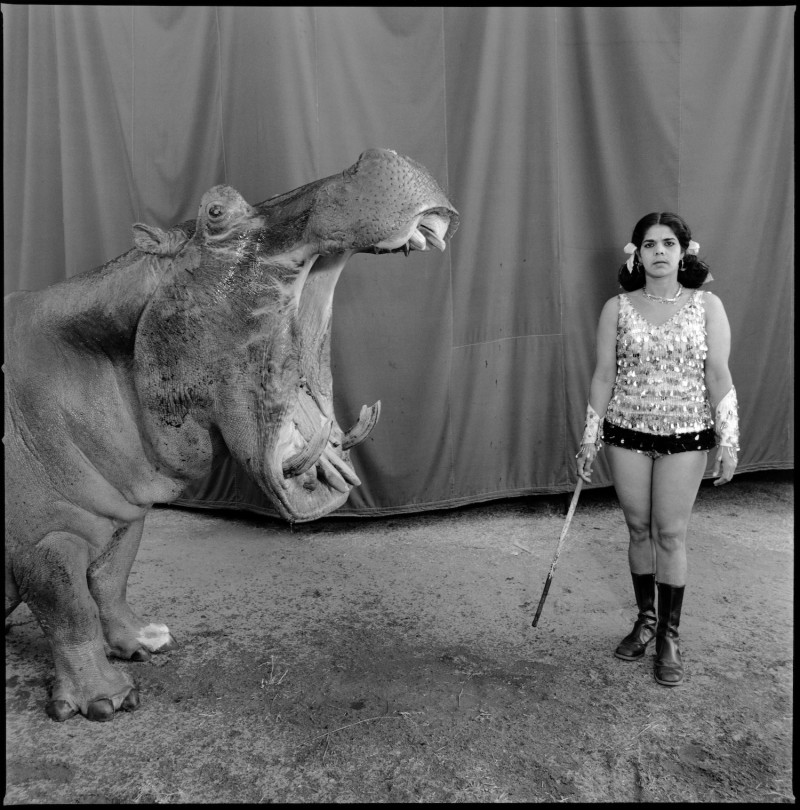 © Mary Ellen Mark: Víziló és artista, Great Rayman Cirkusz, Madras, India, 1989