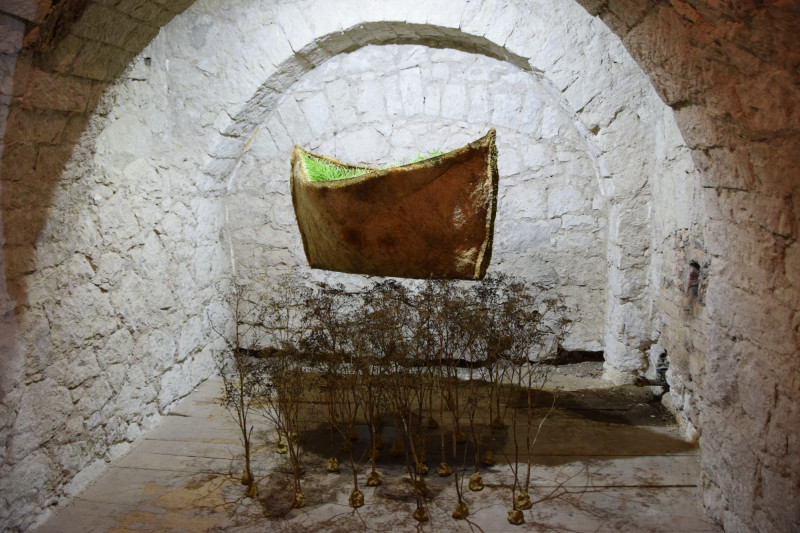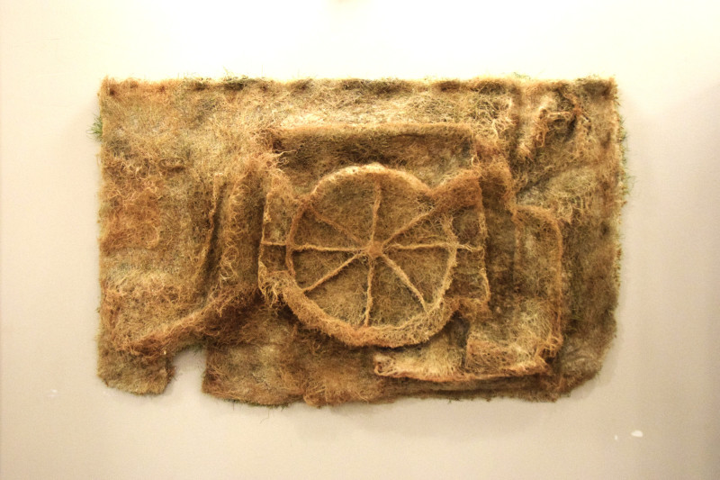 Első pillantásra az anyagszerűségében ragad meg a Rítus című alkotása: vékony kifeszített réteg, amely egyszerre idézi meg a növényi és az állati testet. Felülete úgy feszül, mint az állatbőr, noha búzából született. A bőr az állat testéhez, az érzékeléshez kötődik, a búza pedig a növényvilág, a táplálék és a ciklikus élet jelképe. Ez a munka a lenyúzottság, a sebezhetőség és az újjászületés anyagba sűrített metaforája. Kiindulópontja egy korábbi alkotás, amely pár hónappal ezelőtt a Tállyán, a Huszita-házban még egy csónak formáját öltötte. A művész a csónakvázról később lefejtette a gyökérszerkezetet, ez képezi a „bőrt”, a felületet, amely újraértelmezett formájában, kifeszítve jelenik meg. A gesztus egyszerre rombol és teremt újra. Az előző mű lenyomatából egy másik születik, miközben a természet körforgására, a formák és az anyagok egymásba alakulására reflektál.