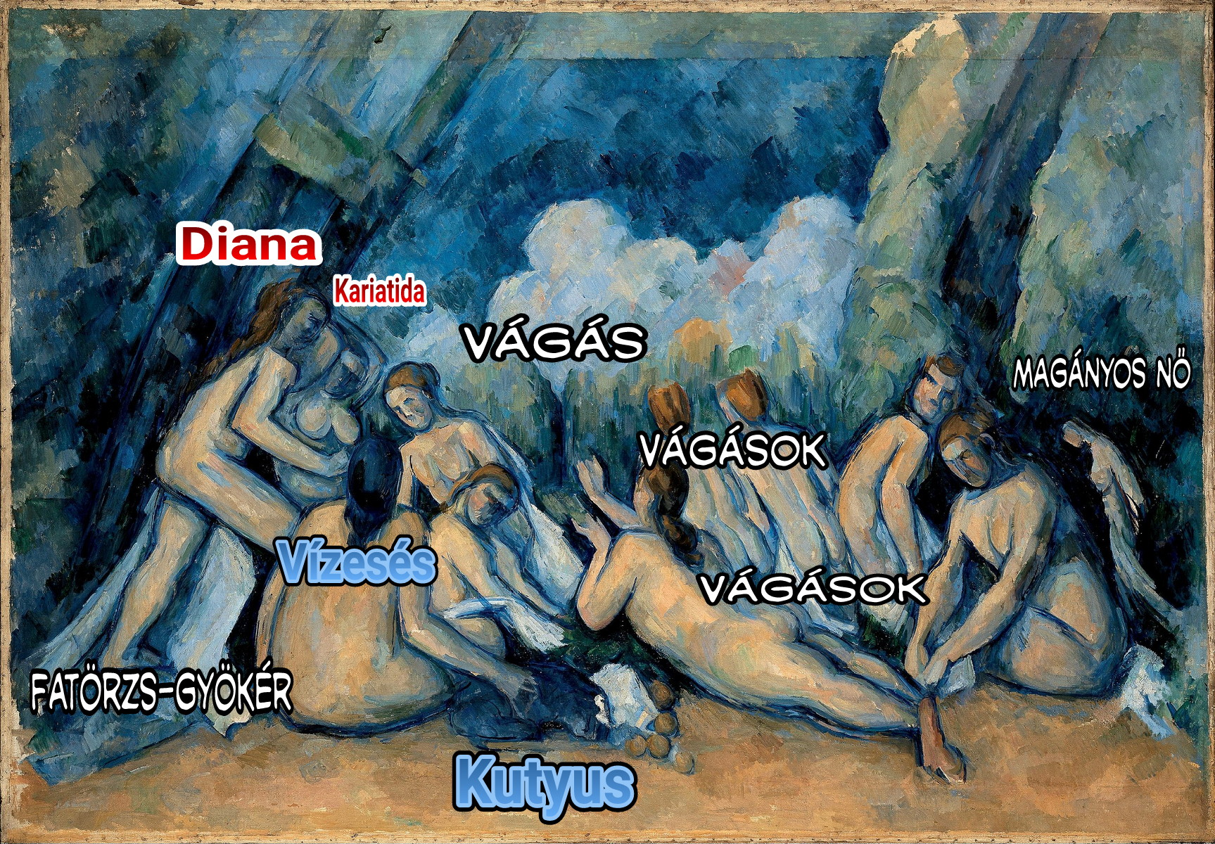 Cezanne azonos címet viselő képe úgy fest Renoir vászna mellett, mintha egy másik bolygóról csöppent volna ide, hiszen nélkülöz minden szépséget, erotikát és melegséget. Rendkívül szemérmes ember lévén Cezanne sohasem festett aktot, híres tájképein pedig sehol sem látunk embereket, így A nagy fürdőzők olyan kulcsmű, amely valóságos manifesztumként hirdeti ki Cezanne sajátos panteizmusát, melynek értelmében a természet minden élő és élettelen eleme ugyanazon „építőkockákból” alakul ki. Képén keresztül tehát a Természet Templomába léphetünk be, amelynek „élő oszlopai” a képet keretező erdei fák, s melyben az említett formakultusz uralkodik: mintha aprócska legódarabkákból próbálnánk rekonstruálni a valóságot: az ég felhőit, a fák lombjait és a növényeket. Természetesen a női aktok is átesnek ezen a mutáción: olyanok, mint a félig kinagyolt márványtorzók, de mintha márvány helyett felhőből faragták volna őket. Nevük is van: a baloldali (3 óránál) robusztus, mozgó nőalak sokak szerint ugyanaz a Diana istennő, mint a fenti Tiziano-képen, a mellette álló női akt pedig egy görög kariatida, akinek teste teljesen össze van nőve a fával, hiszen az egyik „élő oszlopot” tartja a Természet Templomában! Cezanne csendéletei már megmutatták, hogyan csúsznak össze a síkok a térben, ám ezen a vásznon az idősíkok is egymásba folynak. A jobb oldali csoport öt nőből áll, akik legyezőszerűen vannak szétterítve a parton, mint a kéz ujjai. A különböző síkok is hasonló módon csúsznak egymásba, mint egy díszes legyező barázdái, így a hason fekvő lányok barna haja azonos képsíkba kerül a túlparton látható növényekkel és azok „termésének” tűnik. (Hasonló formai analógiát fedezhetünk fel e növényzet és a lányok feneke közt.) Maga a víztükör nem is jelenik meg a képen, vagy teljesen össze van olvadva az éggel, a 6 óránál heverő „kutyus” ellenben erősen emlékeztet egy pocsolyára. A legtöbb érdekességet azonban Diana istennő rejti, akinek minden testrésze más-más képsíkhoz kapcsolódik…