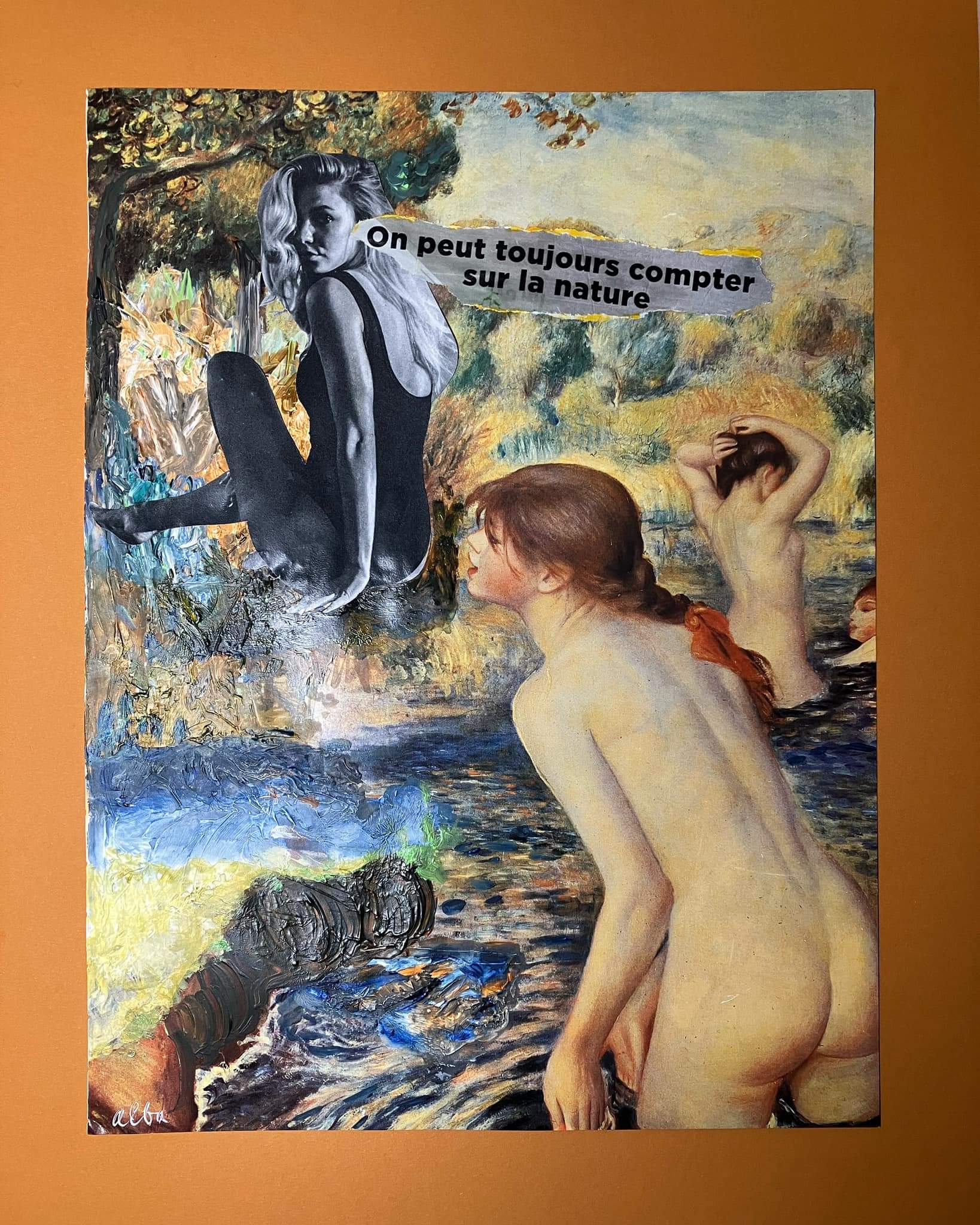 Végezetül kortárs képzőművészeink közül ezúttal Benkő Eszter Renoir-kollázsát emelem ki. A különféle síkok itt is egymásba csúsznak, ami rendkívüli mértékben kedvez a vágásokon és ragasztásokon alapuló kollázstechnikának. Egy régi, fekete-fehér, francia nyelvű divatmagazinból származó fürdőruhamodell – már a modernebb női szépségeszmény diabetikus ideájaként – arra figyelmeztet, hogy „mindig számíthatunk a természetre”. Csakhogy mivel változnak az idők és senki sem léphet kétszer ugyanabba a folyóba, így Benkő Eszter sem elégedett meg a kollázstechnikával, és durván belefestett a képbe. Lefestette Renoir szépséges modelljeit és fekete olajfoltokkal szennyezte be a vizet. Nem csupán egy környezetszennyezés elleni újabb propagandát látunk: a kollázstechnika lényege az újrahasznosítás, ami így a környezetbarát megoldások lehetőségére hívja fel figyelmünket.