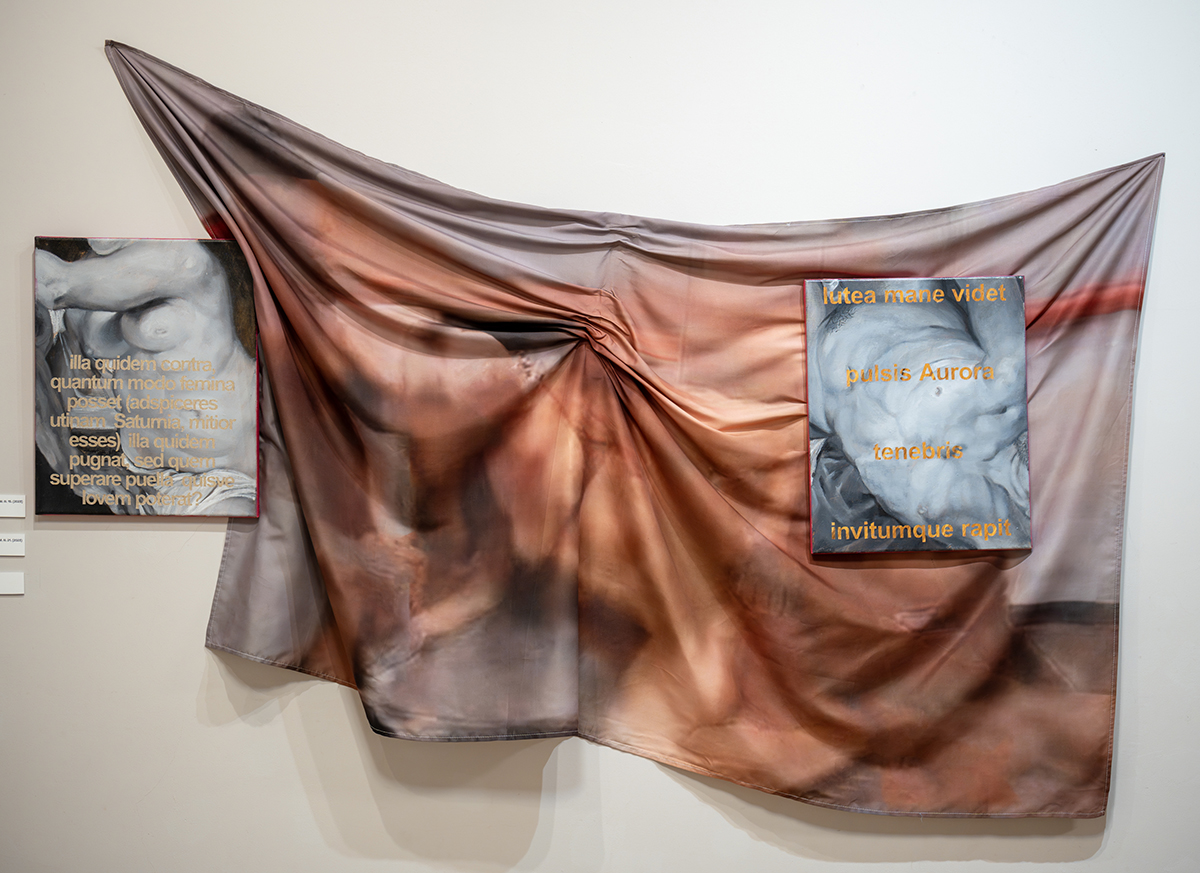 Benyovszky-Szűcs Domonkos festményei közül kettőn a pointillizmus, a pixel és a raszter egybefonódik. Ezeken fotóalapra felvitt felbontások rendezik újjá a testképeket, aktokat, félaktokat. Élénk színhasználatuk és vaskos (pasztőz) festékfelhordásuk olyan vibrációs folyamatot idéz elő a szem számára, melyben – akár egy hőtérképen – behatolunk a test belsejébe és vizsgálhatjuk azt. Egy másik munkáján Ovidius-idézetekkel a test áruba bocsájtásának évezredes problémáját, az akttól a pornóig terjedő kiszolgáltatottságát vizsgálja.