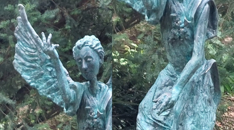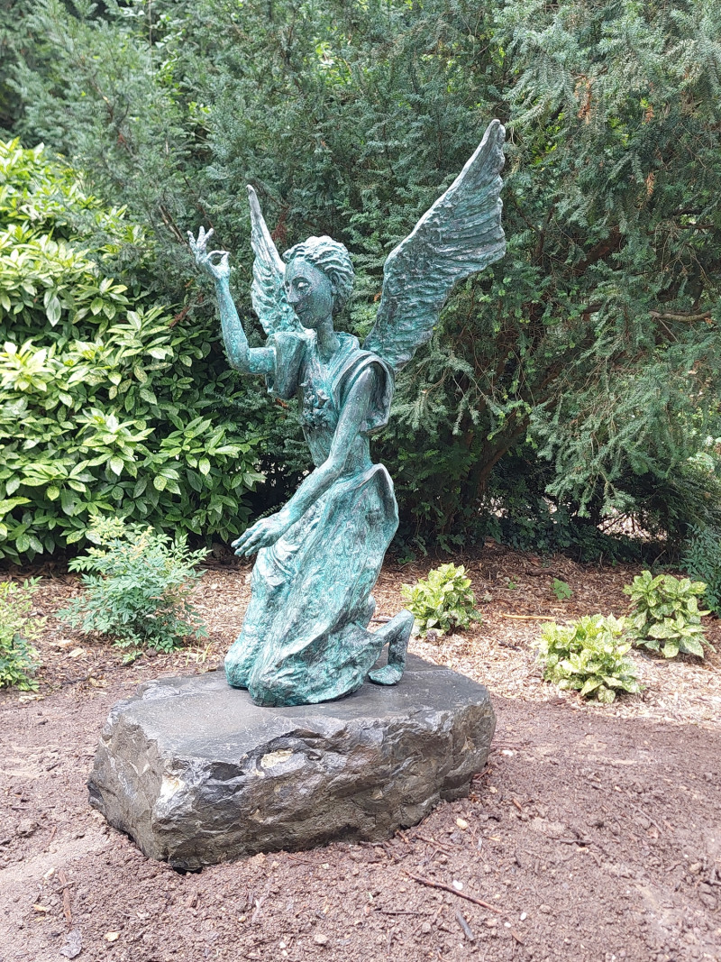 Tóth Ernő szobra e festménnyel folytat meditatív párbeszédet, de háromdimenziós formában, a tér és az anyag nyelvén. A szobor nem realista, inkább stilizált, a test arányai elnyújtottak, a felület élő anyag hatását kelti. A patina zöldes árnyalata összhangban van a pannonhalmi kert növényzetével. A térdelő angyal így nemcsak Máriának, hanem a szemlélőnek is szól, mozdulatában benne rejlik a közvetítés, a szolgálat, az Isten felé fordulás.