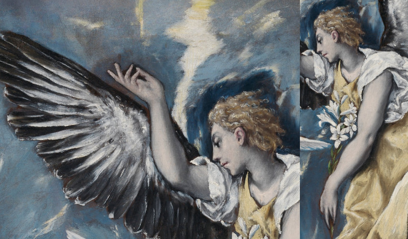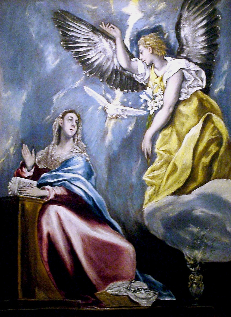 El Greco, a krétai születésű Domenikos Theotokopulos a manierizmus és a spanyol misztika határán teremtette meg sajátos festői nyelvét. A Szépművészeti Múzeumban őrzött Angyali üdvözlet című festménye középpontjában Mária és Gábriel angyal találkozása áll. Az angyal a magasból ereszkedik alá, szárnyai hatalmas ívben tárulnak szét, ruhája aranyló, a fény szinte belülről árad belőle. Mária térdel, kezében könyv, mintha éppen az Írást olvasná, amikor az égi hírnök megjelenik. Fejét kissé félrehajtja, egyik kezét mellkasa elé emeli. Ez a gesztus az alázat, az engedelmesség és a megértés mozdulata. A két alak között a fehér galamb, a Szentlélek szimbóluma lebeg. Az egész kompozíció felfelé irányul, a színek – az arany, a kék, a bíbor – egymást erősítve sugározzák az isteni jelenlét fényét. El Greco számára a festészet Isten jelenlétének láthatóvá tétele.