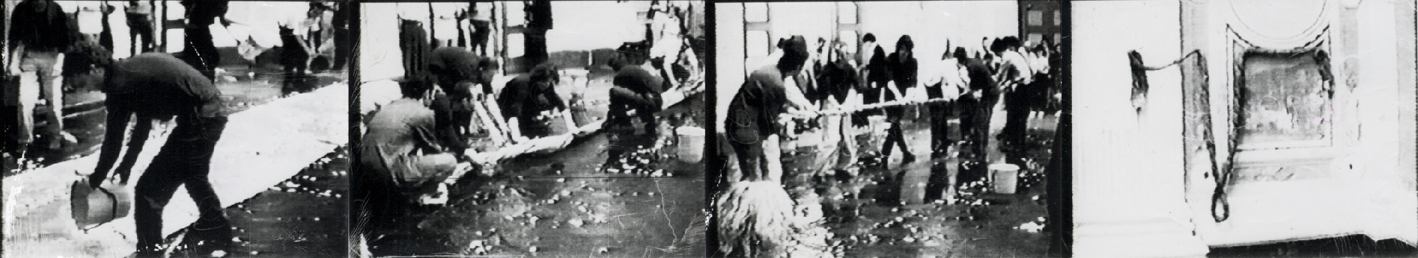 Szili Pista találta meg az egykori Hungária Fürdőt a Dohány utcában, ahol filmforgatás zajlott, azt hiszem, éppen valamelyik Gothár-film készült, ott statisztált és összehaverkodott a kulcsos emberrel, aki a forgatás után beengedett minket. A különleges teret renoválták, most luxusszálloda van ott, de akkor teljesen romos volt. Itt szerveztük első akciósorozatunkat 1989 nyarán, aminek azután lett egy második része is, annyira jól sikerült.