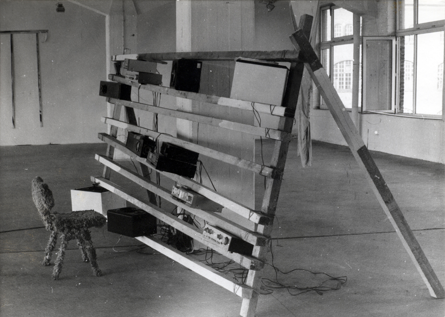 Ebből a szempontból az egy hónapra szóló kasseli rezidenciánkat említem, ahol nagy, üres ipari teret kaptunk, volt idő kibontani a különböző spontán ötleteket, emellett sok félkész munkát is vittünk, amelyek ott nyertek formát. Nem műtárgyban gondolkodtunk – nem is maradt fenn semmi, mert efemer műfajban dolgoztunk –, hanem erősen a térre reagáltunk, emiatt az installáció hazai elterjedését is sokan hozzánk kötik. Az installáció mint műfaj egyébként a hatvanas években alakult ki, a New York-i akciók, happeningek nagy méretű tárgyi kellékeiből lettek a korai installációk. Mindez persze nagy tereket igényelt, és erre kiválóan alkalmasak voltak az általunk használt helyek: a Tűzoltó utcai kiállítótér például ezer négyzetméter volt.