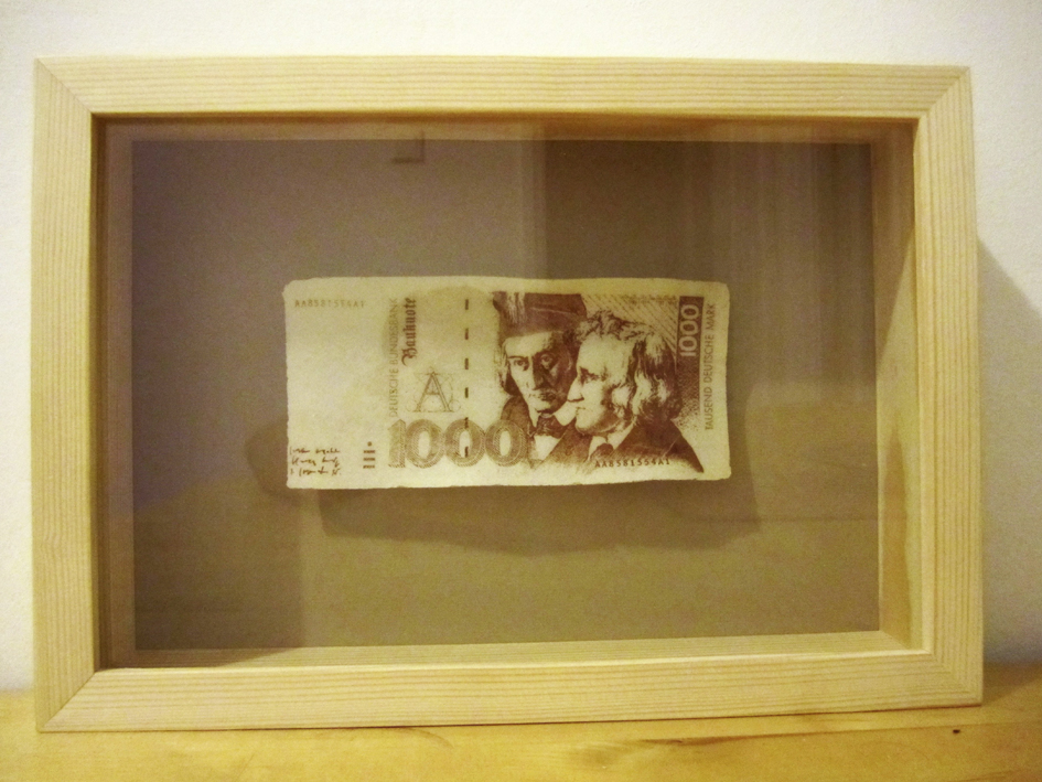 Az Ehető pénz kicsit más, mert azok nem műtárgynak készültek, hanem az 1994-es műcsarnoki Újlak-kiállítás megnyitójára happeningnek képzeltem el, arra szántam, hogy a látogatók elfogyasszák. Elkészítettem ezer darab ötezer forintost ostyára szitázva, és azért kellett csokoládéval, hogy ehető legyen. Nyilván ez metaforikusan utal arra, hogy a fenntarthatónak nevezett gazdasági növekedés hazugsága helyett a pénzt a természeti értékek megóvására kellene fordítani, mert ha nem így teszünk, az ökoszisztéma összeomlása után egy disztópikus világban a pénzt már nem lesz mire elkölteni. Egy évvel később felkértek, hogy Hamburgban csináljam meg német változatban, így lett német márka ezres címletben, később Franciaországban kétszáz frankos is készült. Ez utóbbi volt egyébként grafikailag a legnehezebb, mert nagyon cizellált minta, ezt szitával, csokoládéemulzióval templomi ostyára megvalósítani nem volt könnyű feladat. Eltelt tíz év, és amikor néhány megmaradt darabot megtaláltam, rájöttem, hogy milyen szép mint grafika, és beraktam kis dobozokba, üveg mögé. Keletkezéstörténete miatt konceptuális objekt lett belőle, később olyan sikeressé vált, hogy ez lett az egyik legkedveltebb művem.