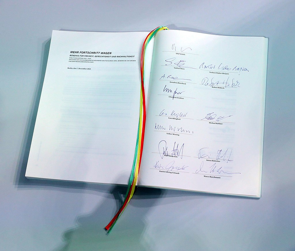 Koalíciós szerződés a jelzőlámpa-koalíció színeivel (képek a Wikipédiáról)