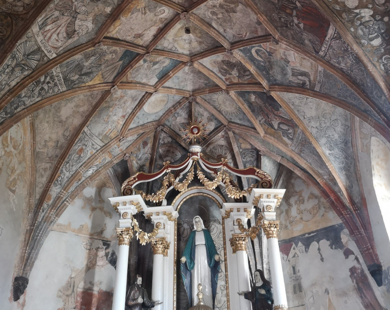 A templom legrégebbi alkotóeleme a mostani sekrestyén található rózsaablak. A kicsi szentély hálóboltozata pedig magával ragadó, hihetetlenül szép, pontos illesztésekkel, faragásokkal. A bordák kereszteződéseinél pajzsok találhatók, festett címerekkel,