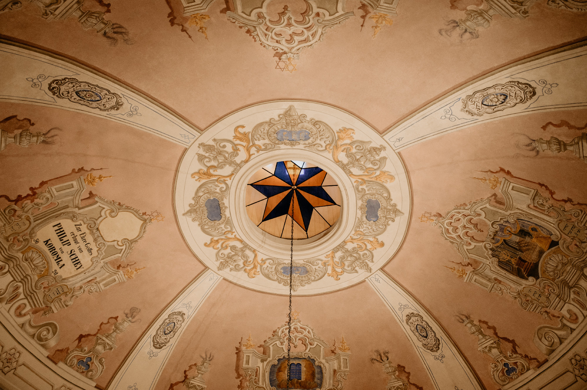 Hasonló indíttatással dolgoztak a restaurátorok Nagy Gábor László vezetésével. Az évtizedes felvételek arról beszélnek, szinte lehetetlenre vállalkoztak, amikor az utolsó utáni pillanatban munkához láthattak. Lepergett, elmosódott, szétfoszlott festménydarabokból hozták vissza a kupola díszítőfestését, az eredeti megmaradt festéseket speciális technikával megtartották, és csak kizárólag azokat a részeket állították helyre, amelyekről hitelesen bizonyítani tudták, hogy szerepeltek a XIX. századi zsinagóga mennyezetén. A kupolában az egyik barokkosan festett keretben a német nyelvű felirat az adományozóra emlékezik: Isten dicsőségére építtette koromlai Schey Fülöp.