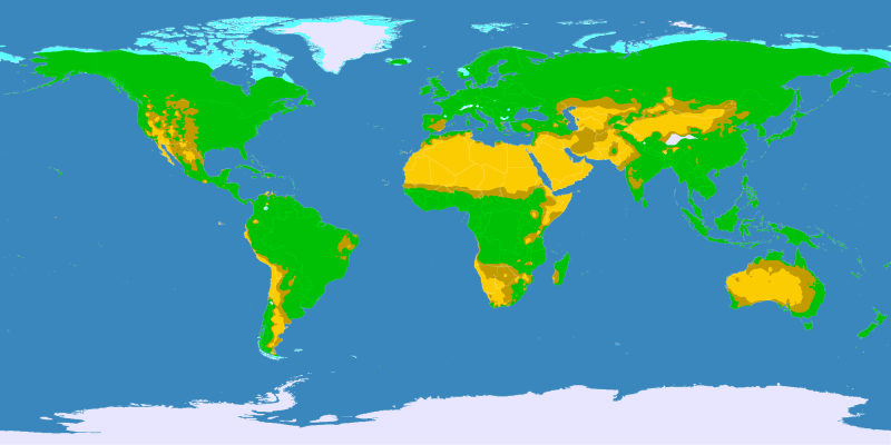 A világ sivatagos területei (sárga színnel) (forrás: LordToran, CC BY-SA 3.0, Wikimedia Commons)