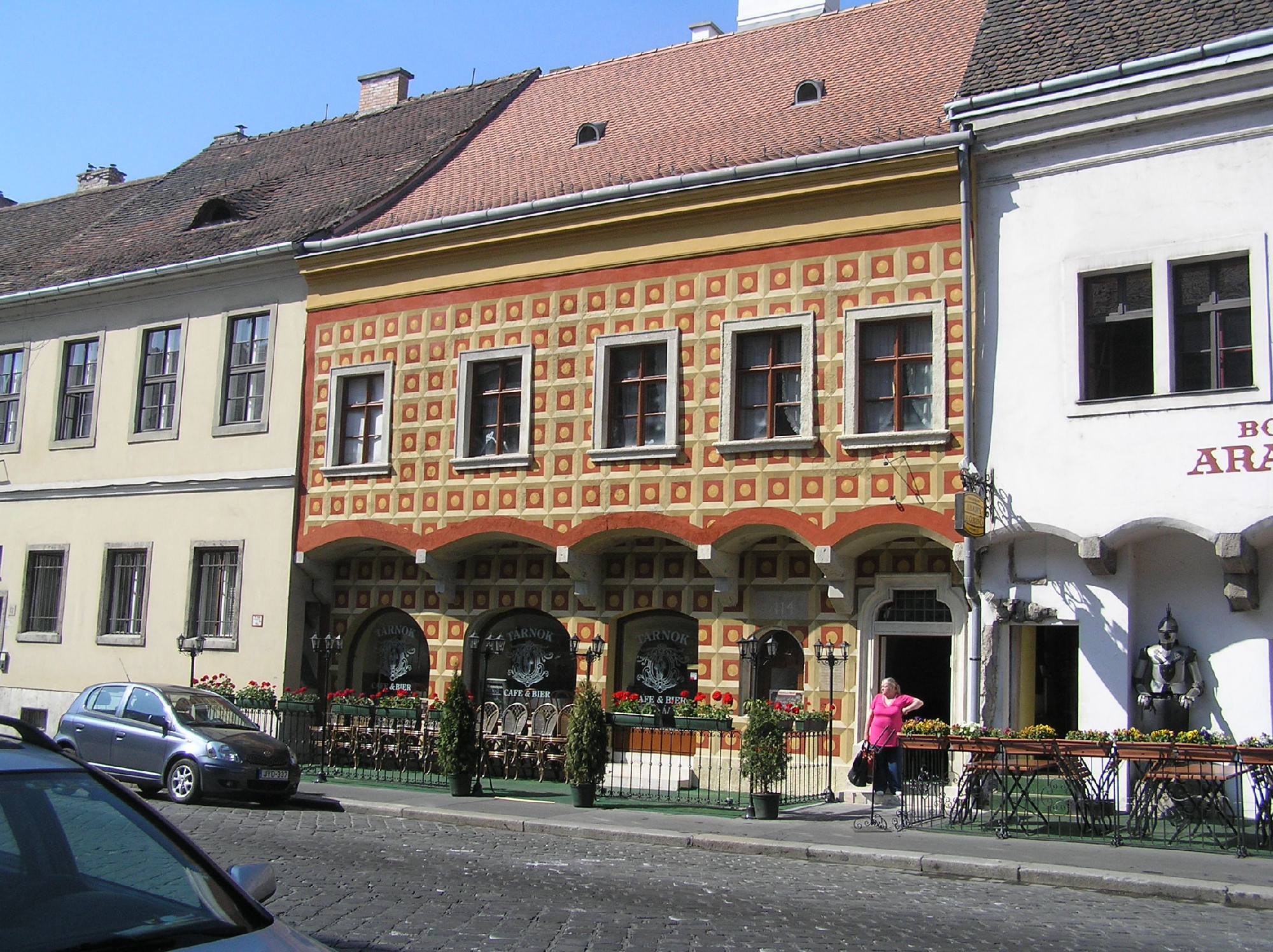 Díszes, festett homlokzatú középkori kereskedőház a Tárnok utcában