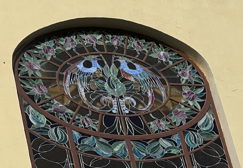 Az ajtónyílás fölötti színes ólomüveg ablakok, akárcsak a lépcsőháziak, Róth Miksa alkotásai, a tengeri kikötőt mutató mozaik Sonnenberg hivatására utalt.