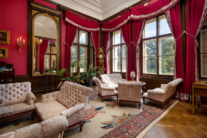 A nagyvonalú, elegáns fogadószalont minden valószínűség szerint a kor ízlése nyomán rendezték be, a földszinten helyezték el a gróf és a grófné lakosztályát, s díszlépcső vezetett az emeletre, ahol a vendégszobák kaptak helyet. Az alagsorba került az éleskamra, ott voltak a boros- és veteményes pincék, a gyümölcstárolók és a faszínek, a fatüzelésű kazánból légbefúvással melegítették a tereket, a szalon és a könyvtár díszes kandallóiban talán sosem lobogott tűz. A pincében gőzgép dolgozott, amely a toronyba pumpálta fel a vizet, hogy onnan vascsővezetékbe kerüljön, s lássa el a házat (működését a felújításkor egy földbe süllyesztett fürdőkád előkerülésekor, 2019-ben fejtették meg, a beépített kádas fürdőfülke az eredeti csempedarabokkal és csillárral az egyik legizgalmasabb látnivaló). Gázlámpák világítottak, a világítógázt a konyhaépület mögött elhelyezett „gázházban” fejlesztették.