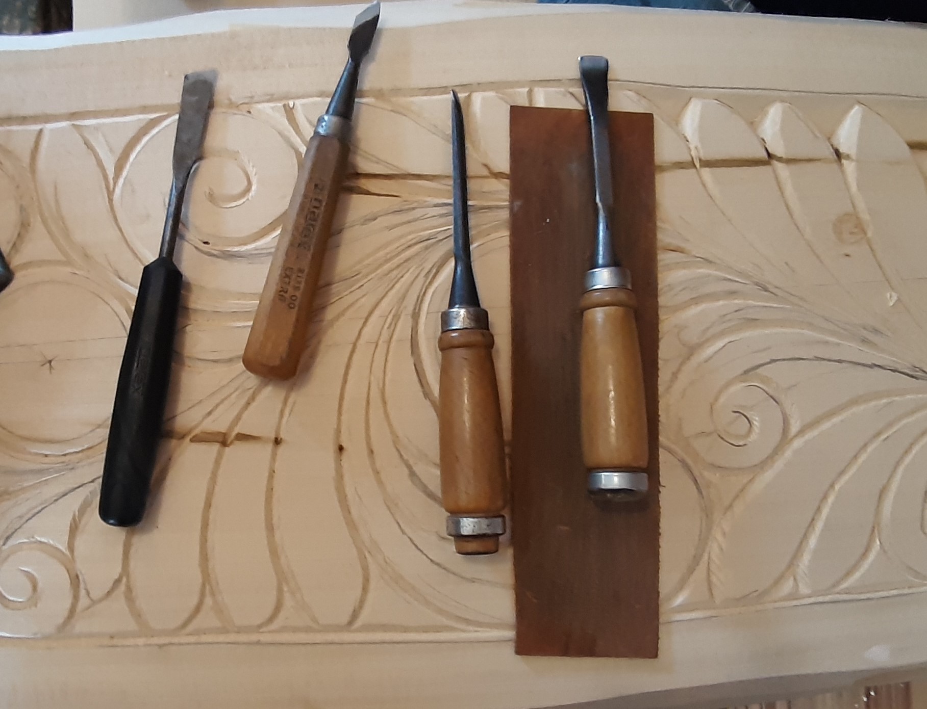 (ő is azon dolgozik épp). A nagyolást motorfűrésszel szokta végezni, egy efféle domborműhöz általában ötféle vésőt használ (kedvencem a kecskeláb), némelyik pengéjén maga is végrehajt apróbb módosításokat. Az esztergált fafaragó kalapács, amivel a vésőnyél végét ütögeti, hagyományosan bunkó névre hallgat, és a keménységben díjnyertes gyertyánból készült.