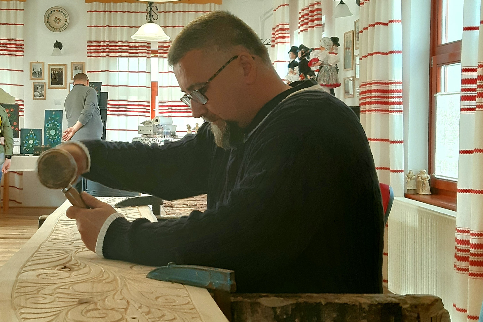 Ezt a szobrot is, akárcsak a kálvária stációit, a 48-as haranglábat vagy az 56-os kopjafát Kanyó Balázs faragta, aki a szombati kézműveskedésre egy kész és egy félkész domborművet hozott magával, meg egy ládika vésőt. Igazából már a ládika is elég ahhoz, hogy megdobogtassa minden barkácsolni szerető ember szívét. Ahogy a növényi ornamentika formálódik vésője alatt, épp úgy kanyarognak a terem másik végében Záhorszki Mónika színes palóc életvirágai a kelengyésládákon és háziáldásokon.