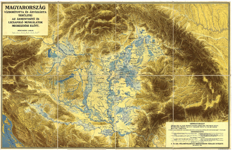 A Kárpát-medence vízrajza a lecsapolás előtt (forrás: Magyar Királyi Földművelésügyi Minisztérium Vízrajzi Intézet Ny. M. Kir. HTI, Budapest – Weiss István (1856), Vályi Béla (1863–1943) et al., Public domain, Wikimedia Commons)