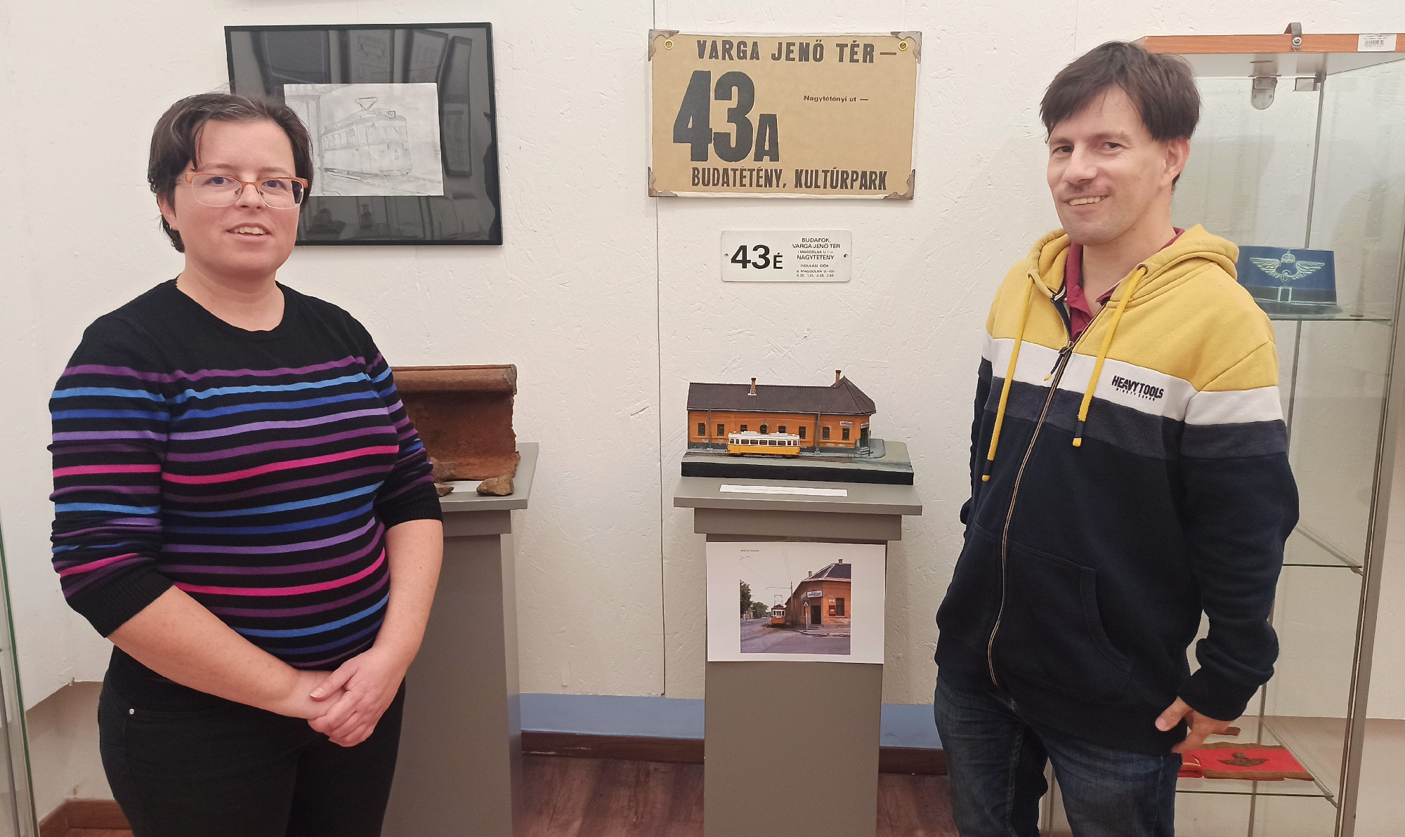 Gyönki Viktória muzeológus és Nehéz György a 43-as villamos makettjével. A makettet Gyönki Viktória és Blahó Tibor készítette (a szerző fotója)