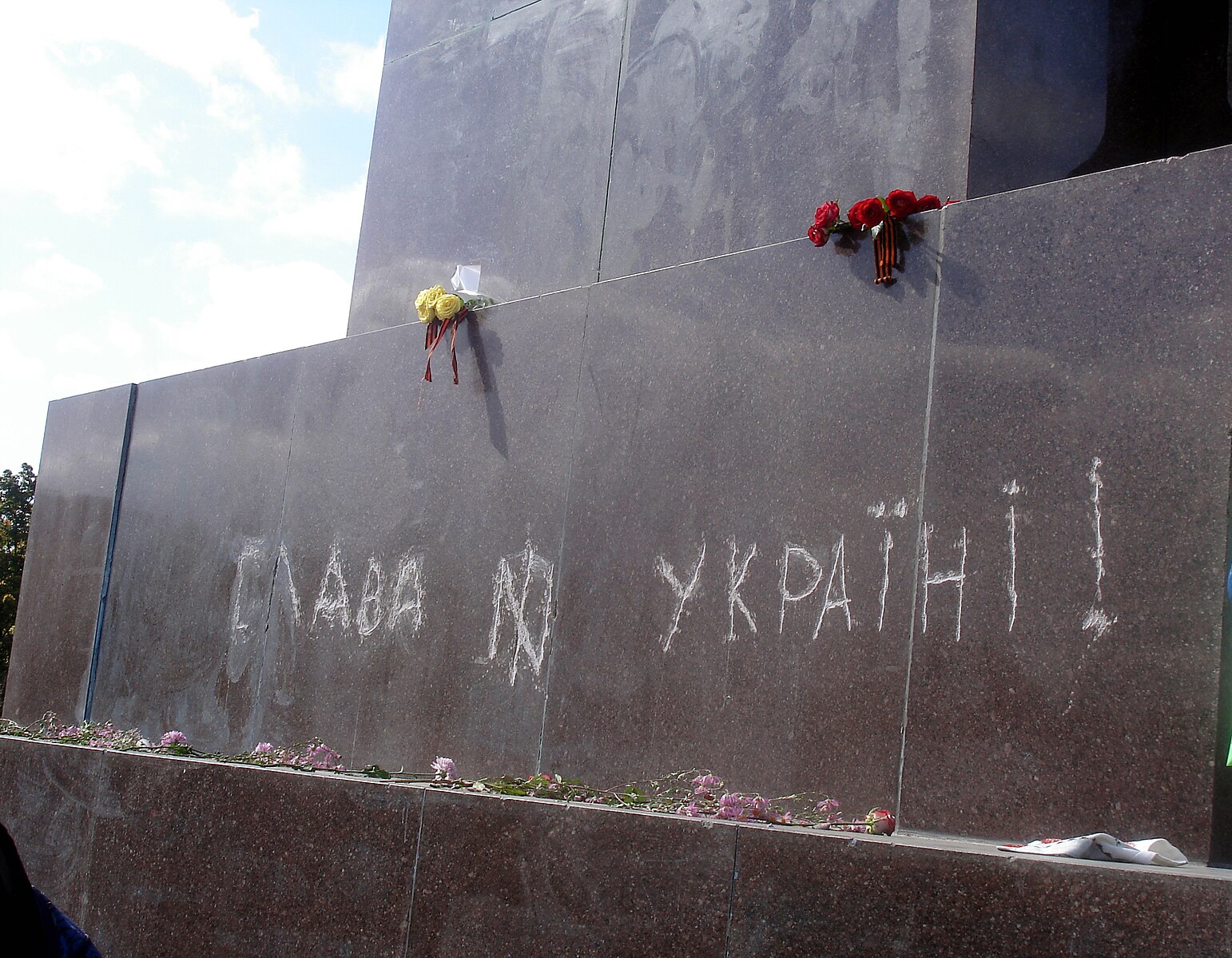 „Dicsőség Ukrajnának” – a ledöntött Lenin-szobor talapzata Harkivban 2014 szeptemberében