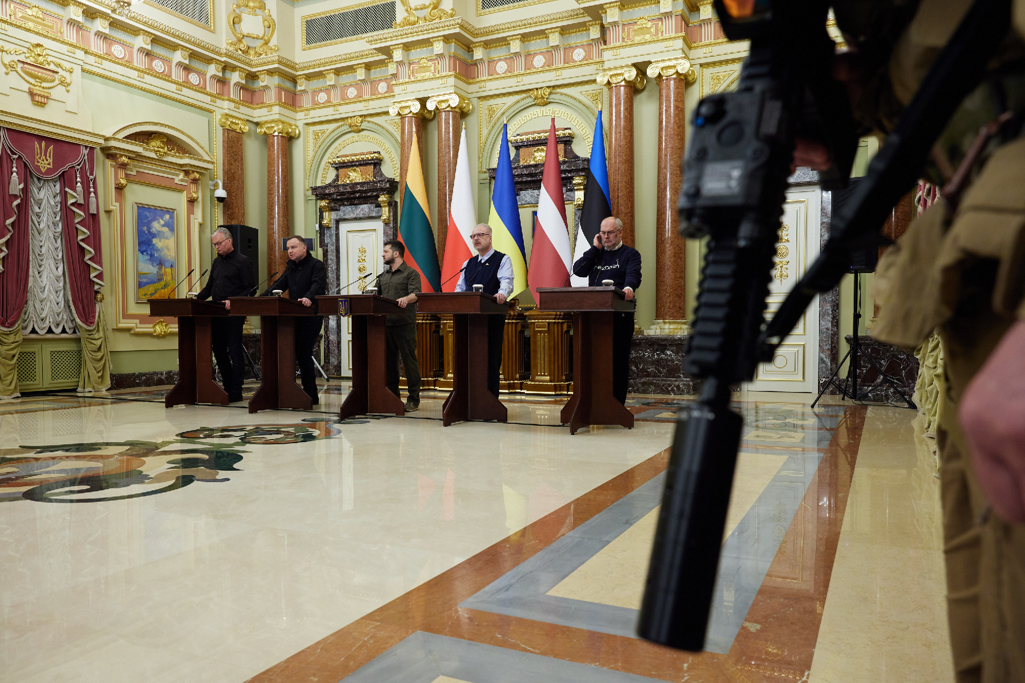 Egils Levits lett, Andrzej Duda lengyel, Volodimir Zelenszkij ukrán, Gitanas Nausėda litván és Alar Karis észt elnök a 2022. április 13-i szolidaritási látogatáson, Kijevben