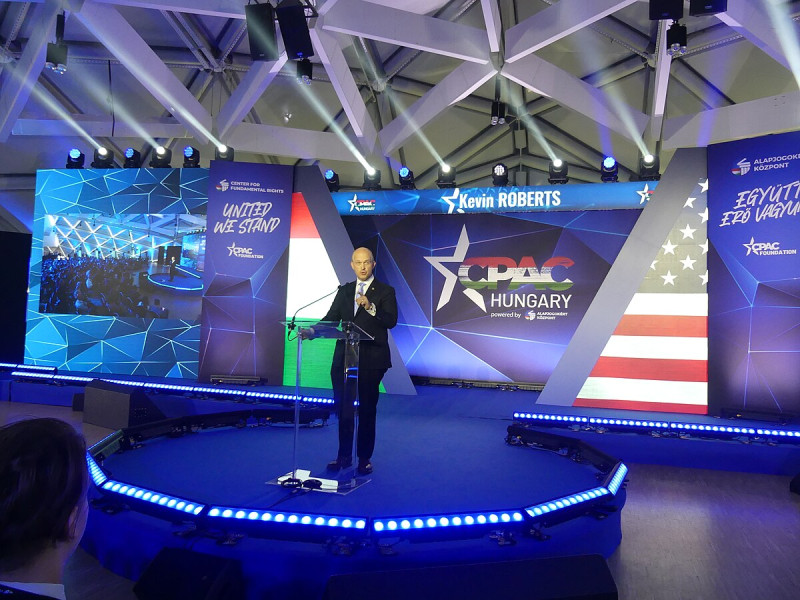 Kevin Roberts, a Heritage Alapítvány elnöke Budapesten 2023-ban; Tucker Carlsont védő nyilatkozatával a konzervatív táboron belüli ellentéteket akarta tompítani, de inkább élezte, és ugyan utóbb hitelesen felülbírálta saját magát, de a feszültséget nemigen tudja enyhíteni (fotó: Elekes Andor, CC BY-SA 4.0/Wikimédia)