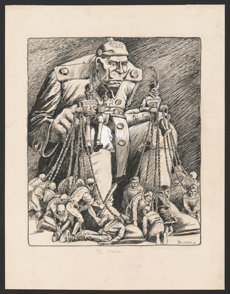 Az úr – Otakar Valasek (1884–1954) cseh-amerikai művész 1918-as chicagói karikatúrája II. Vilmos német császárról, a kezében tartott osztrák és magyar vezetőről és a Monarchia láncra vert népeiről, a nyitókép ennek részlete (Library of Congress, Wikimédia)