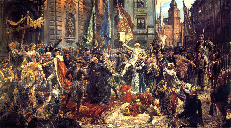 II. Szaniszló Ágost lengyel király és litván nagyfejedelem a Szejm tagjaival együtt bevonul a varsói Szent János-székesegyházba, hogy felesküdjenek Európa első írásba foglalt alkotmányára (Jan Matejko festménye a Varsói Királyi Palotában, Public domain, Wikimedia Commons)