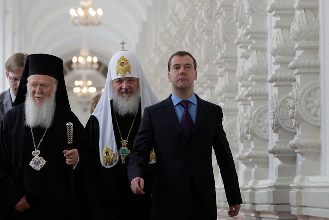 Bartolomaiosz, Kirill és az akkori elnök, Dimitrij Medvegyev a Kremlben 2010-ben (fotó: Kremlin.ru, CC BY 3.0/Wikimédia)