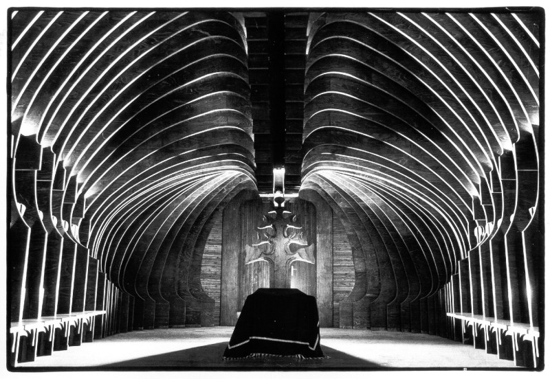 A fiatal Jonathan Glancey érdeklődését fölkeltő épületbelső, a Farkasréti temető ravatalozója (fotó forrás: Makovecz Imre Alapítvány/Műcsarnok sajtófotó)